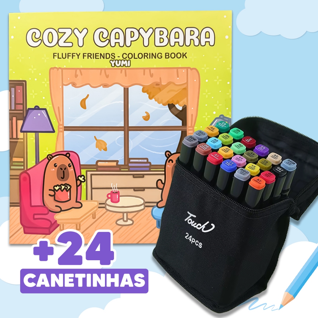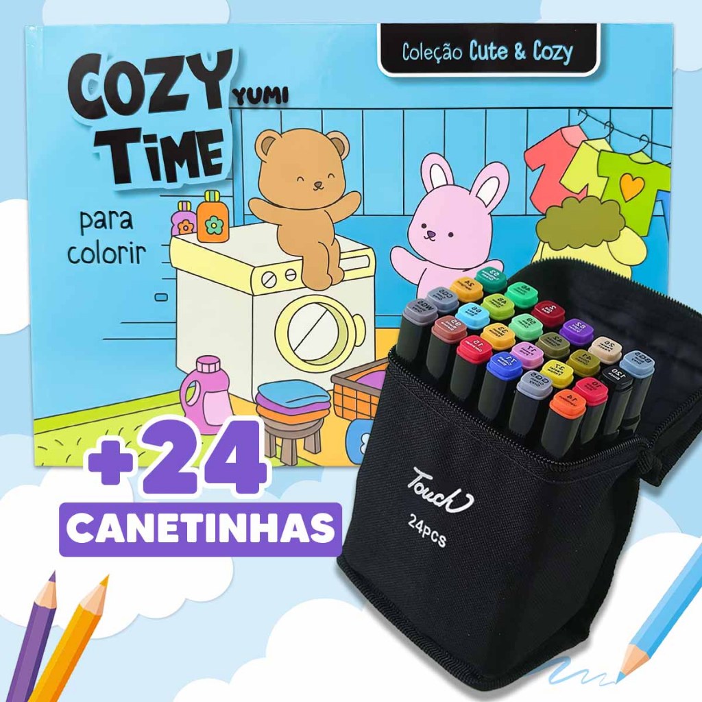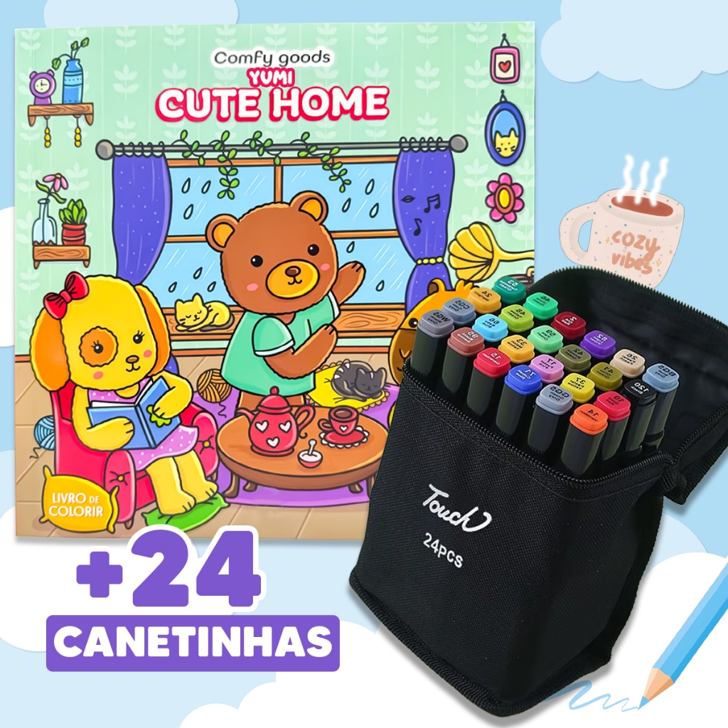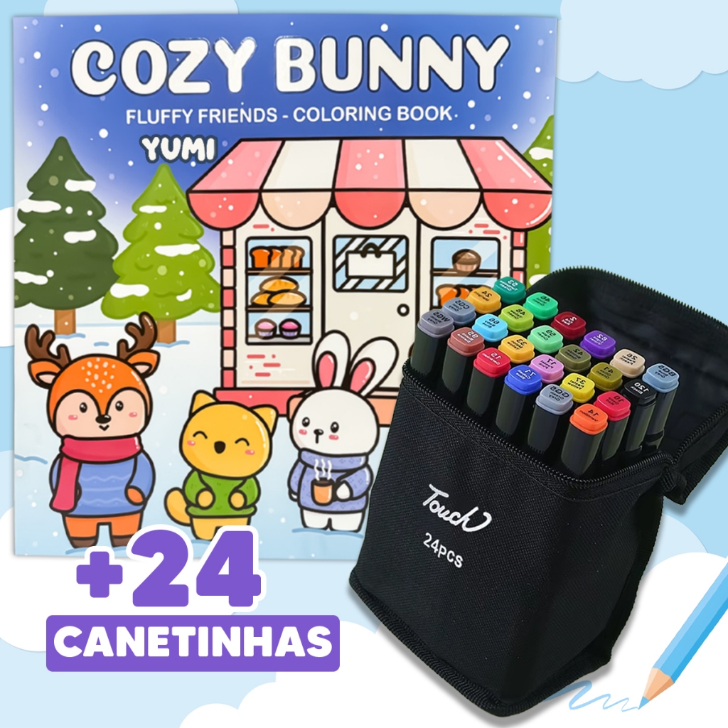 Kit Livro De Colorir Cozy Comfy Goods + Estojo Bolsa Canetas Canetinhas Touch Ponta Dupla