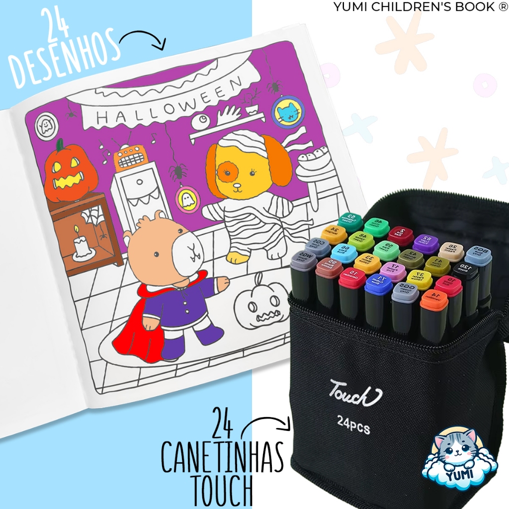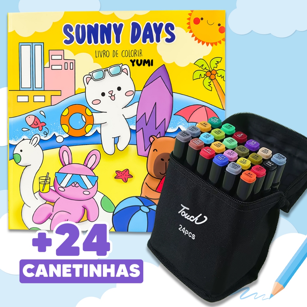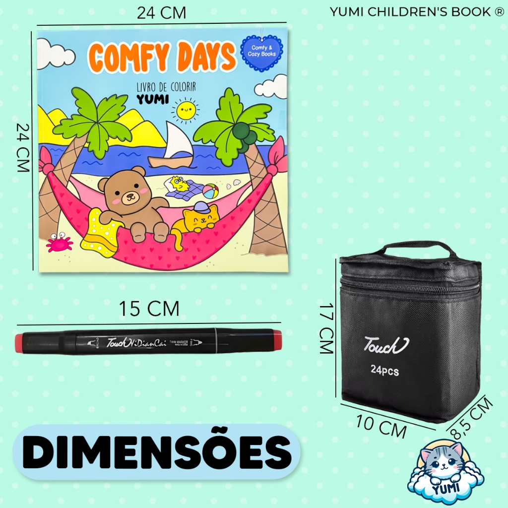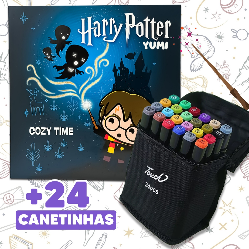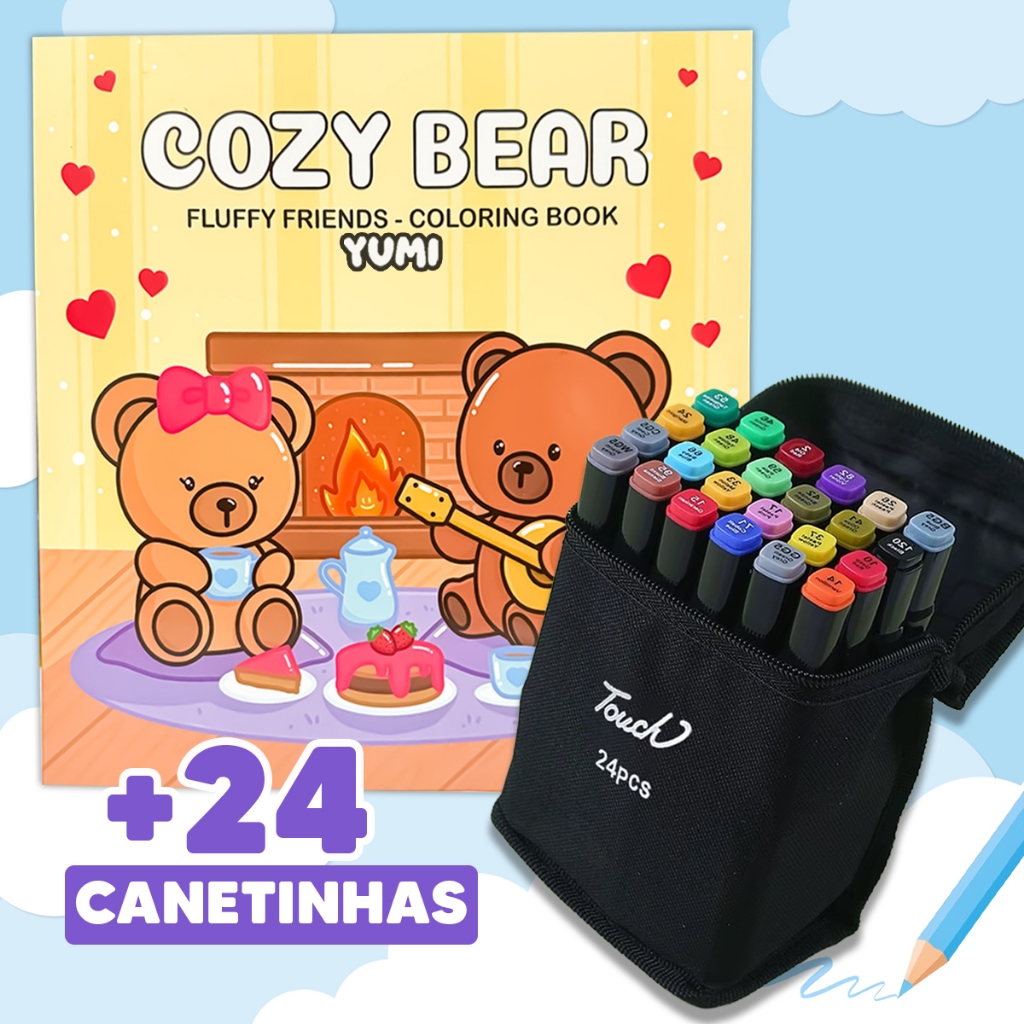 Kit Livro De Colorir Cozy Comfy Goods + Estojo Bolsa Canetas Canetinhas Touch Ponta Dupla