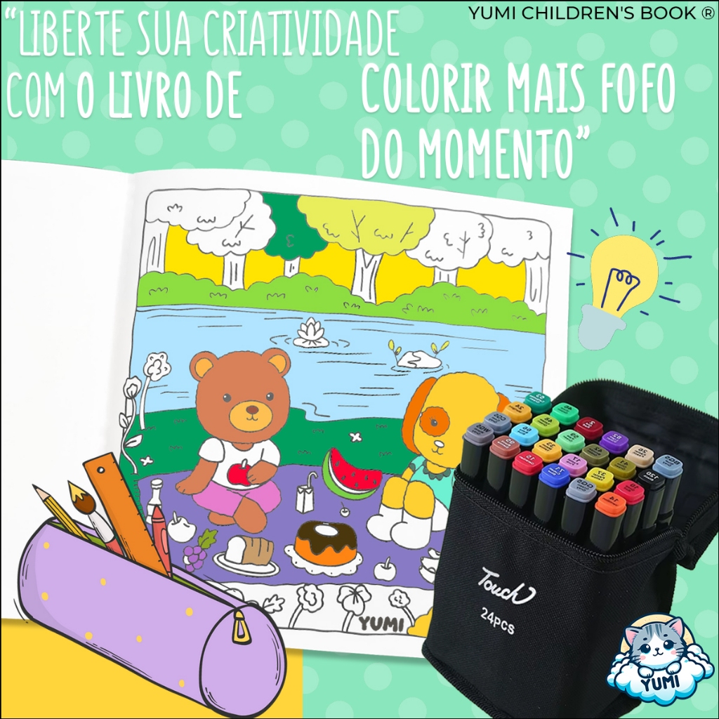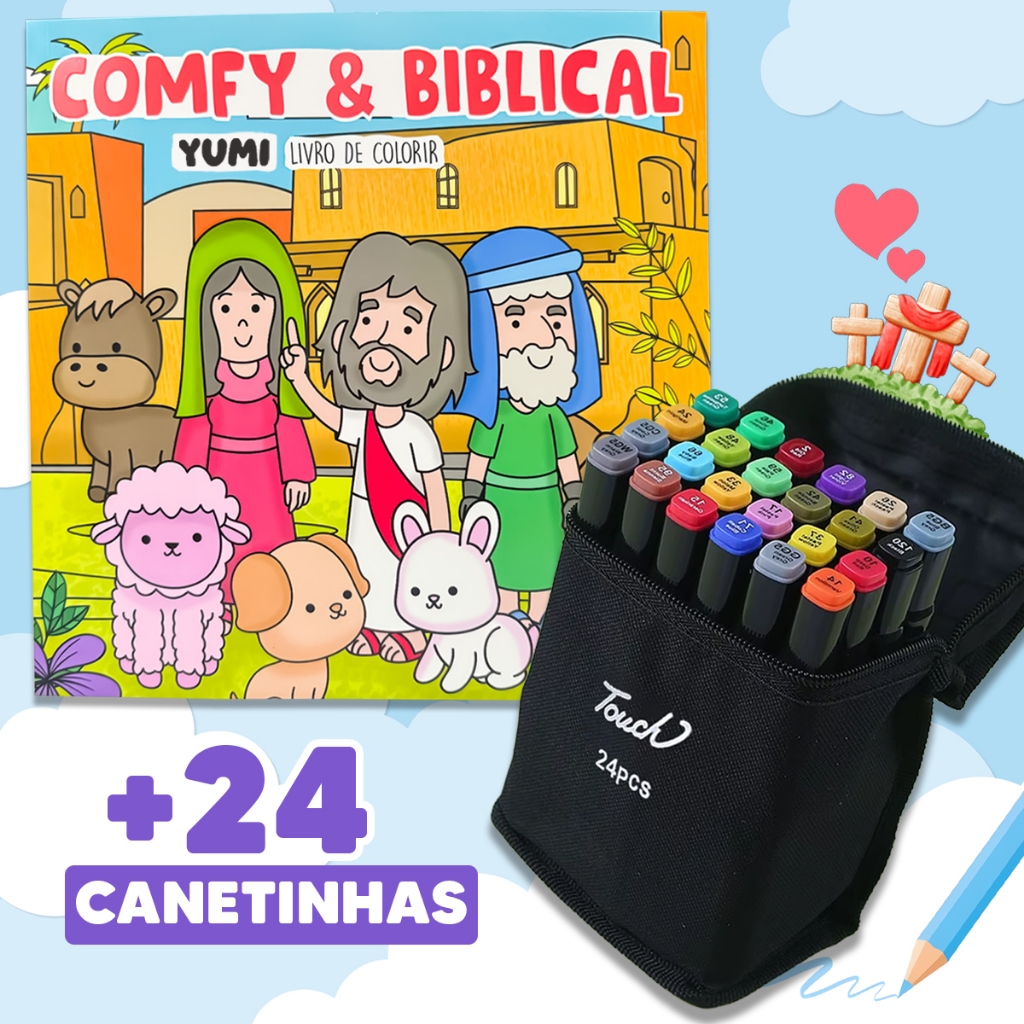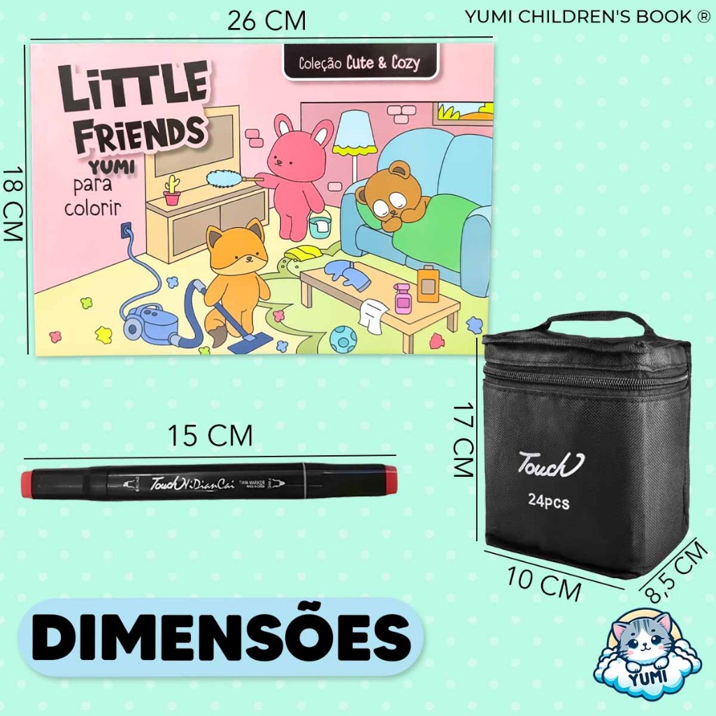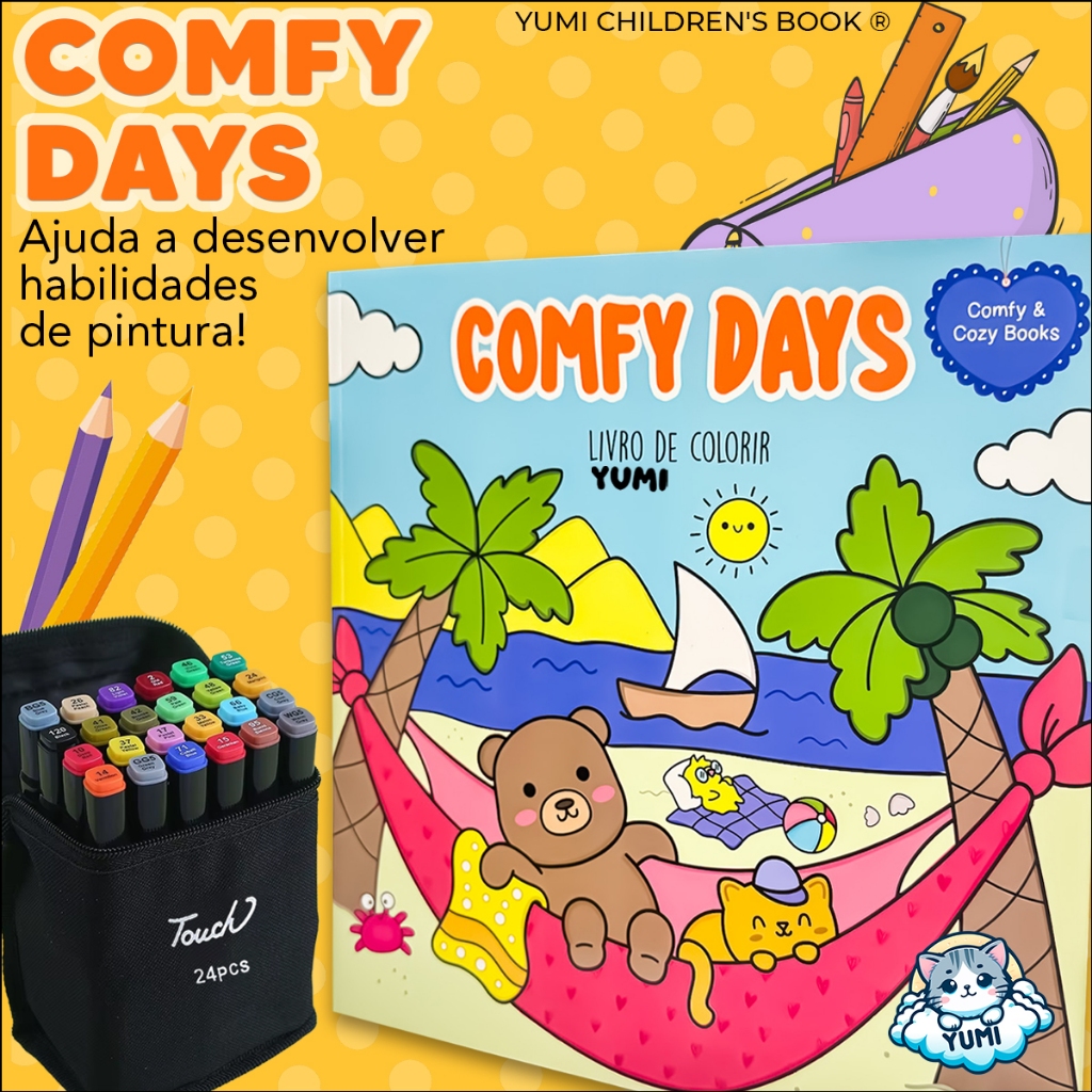 Kit Livro De Colorir Cozy Comfy Goods + Estojo Bolsa Canetas Canetinhas Touch Ponta Dupla