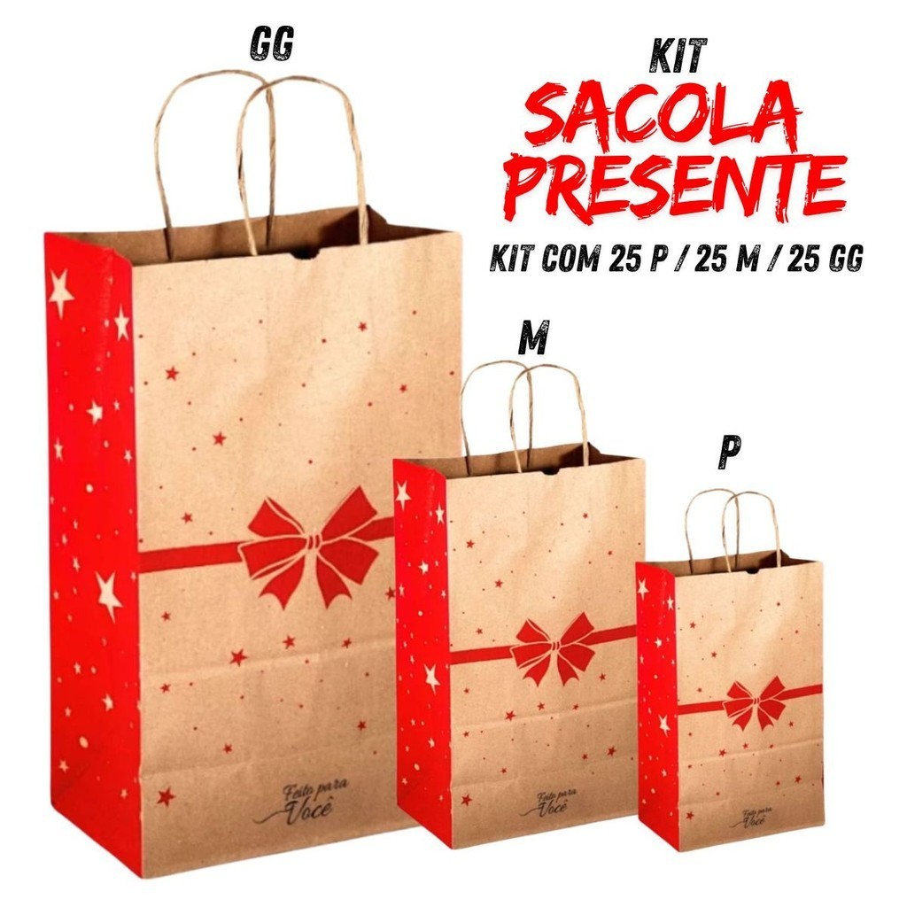 KIT 75 SACOLA KRAFT LAÇO P M GG 25 CADA BOLSA LEMBRANCINHA