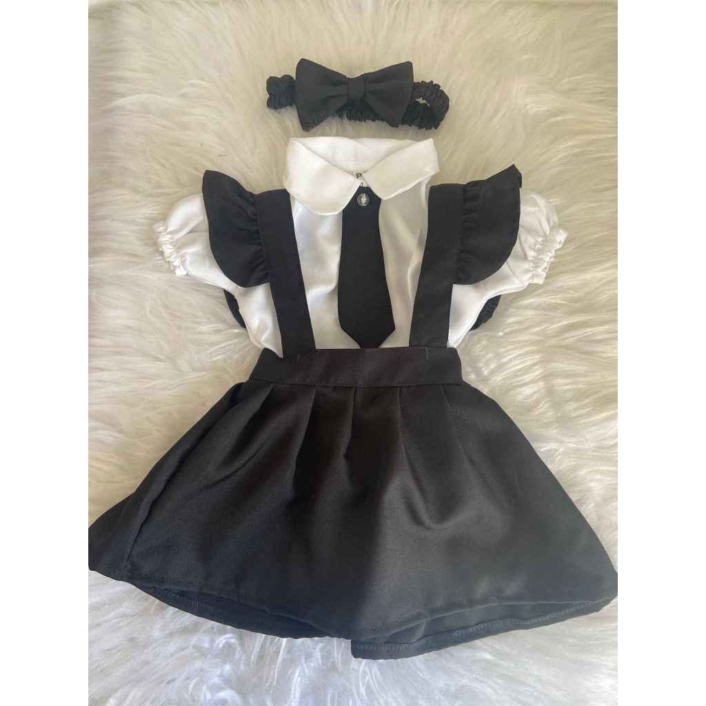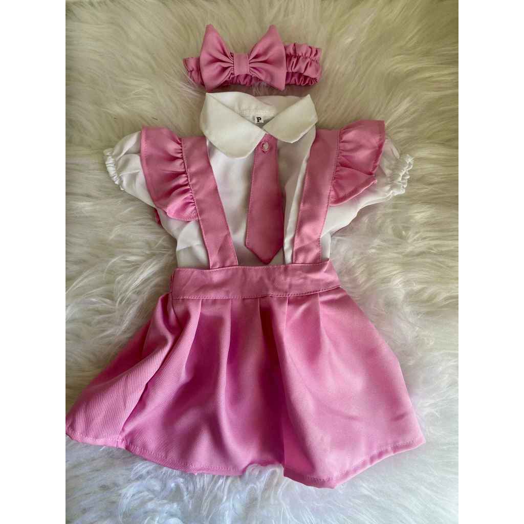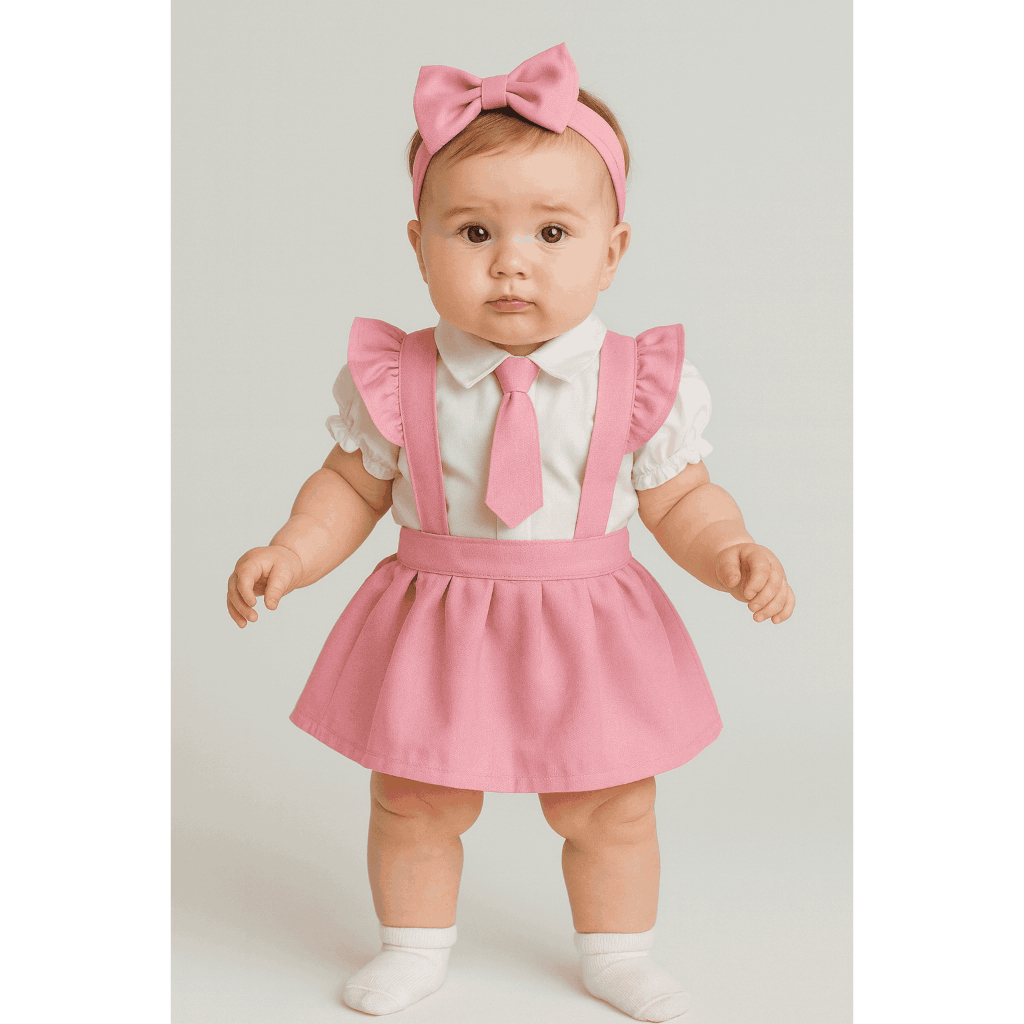 Conjunto Social infantil Feminino Camisa Gravata Saia Menina Bebe Suspensório 4 Peças