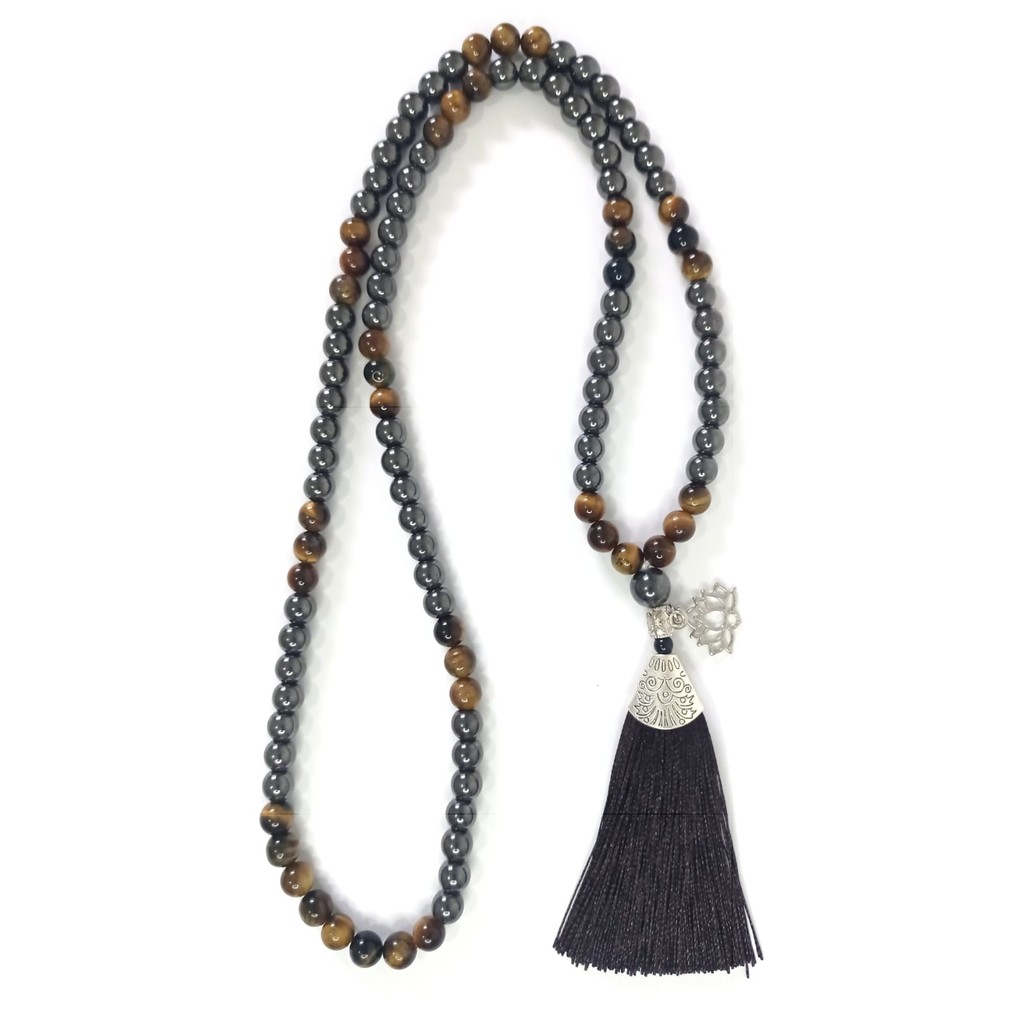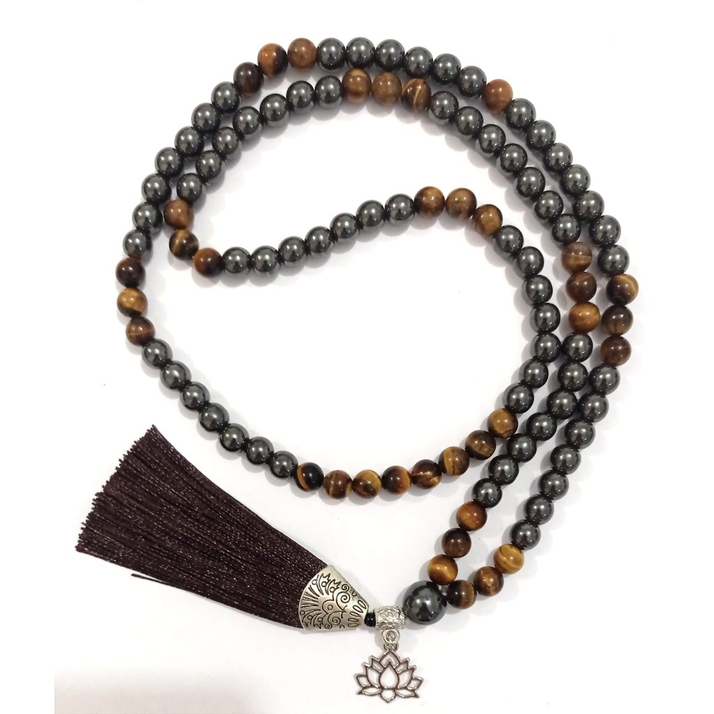 Japamala 108 Contas Hematita Olho de Tigre Pedra Natural Flor de Lotus