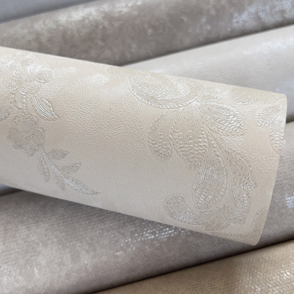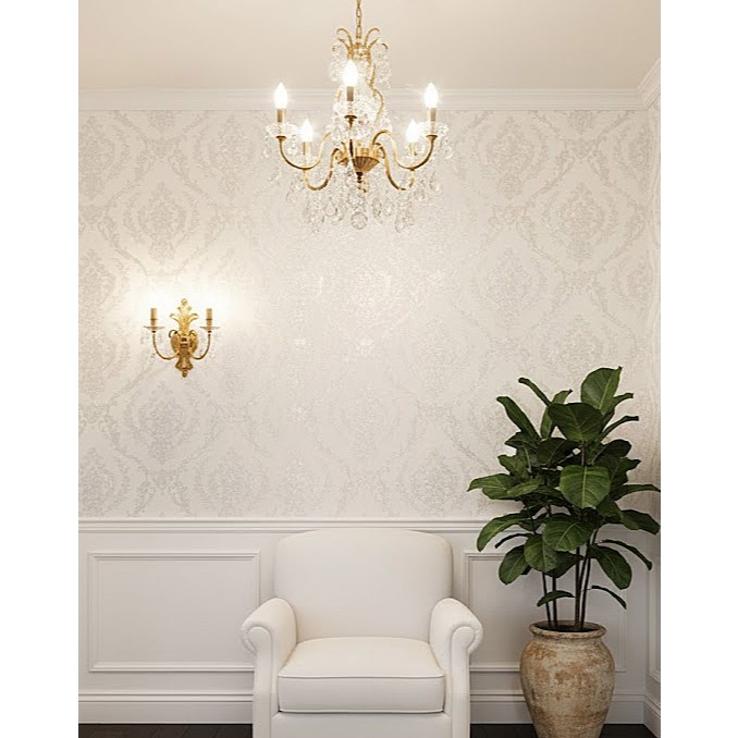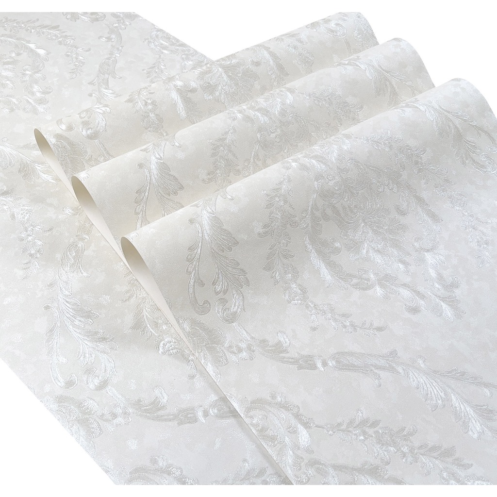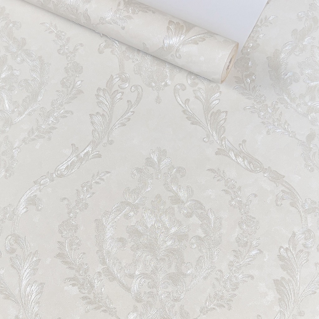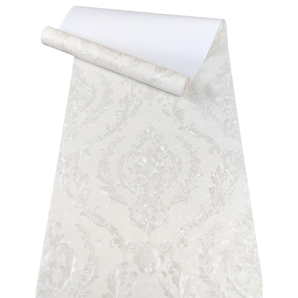 Papel de Parede Importado Damask Branco Perolado com Brilho - Rolo Vinílico Alto Relevo 10m x 53cm - Cola Inclusa