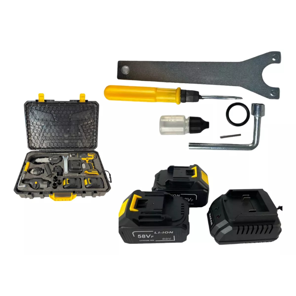 Kit Ferramentas 5 em 1 Furadeira Parafusadeira Motoserra Chave Impacto a Bateria 48V Com Maleta