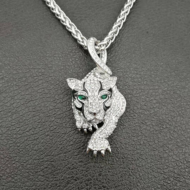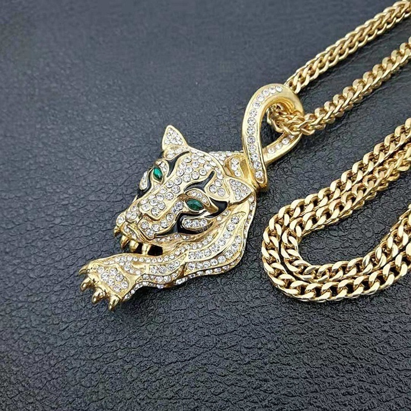 Luxury Men's 18K Gold Inlaid Austrian Rhinestone Emerald Tiger Pendant Necklace