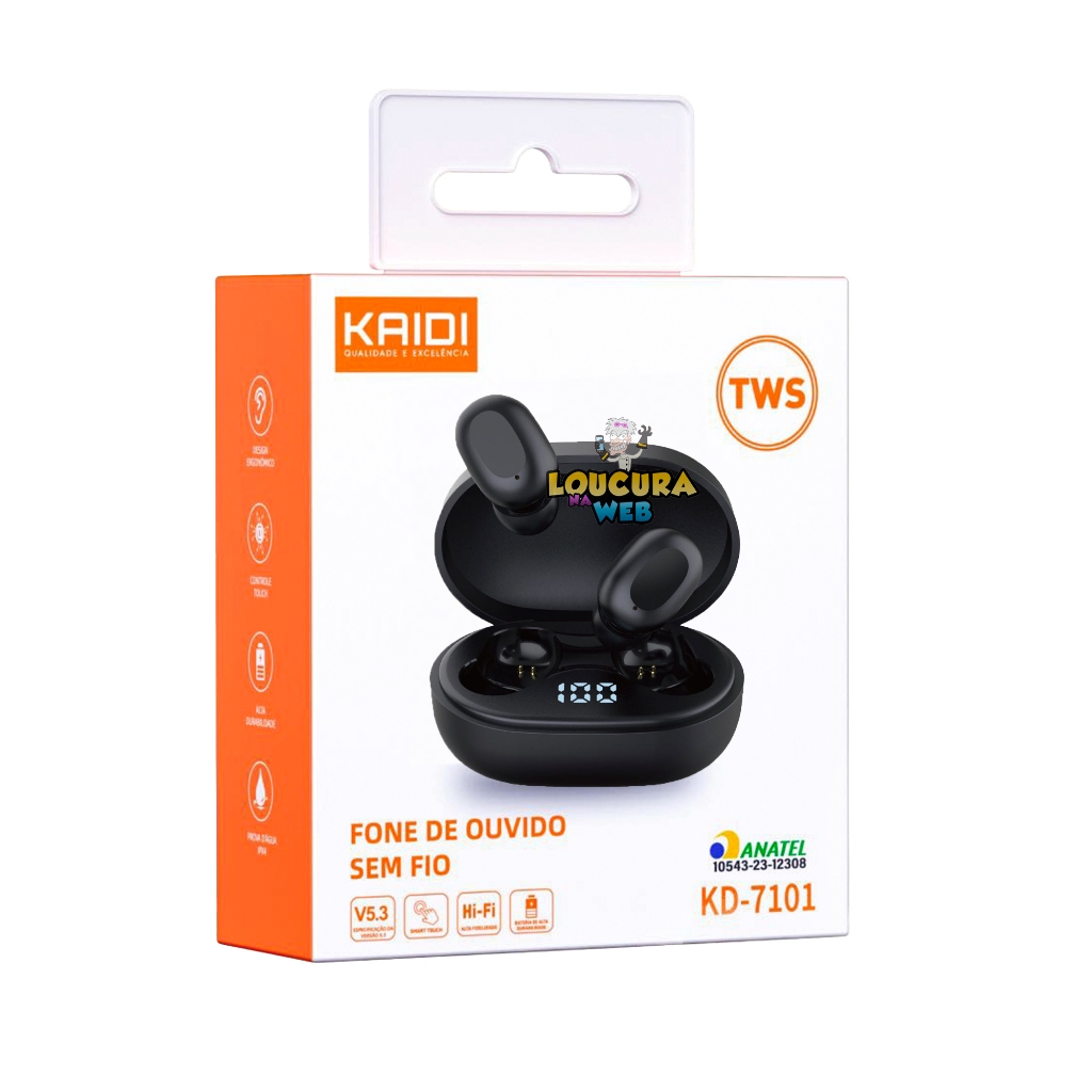 Fone Bluetooth 5.3 Sem Fio Original Kaidi KD 7101 com Visor Led Borrachinhas Touch in ear