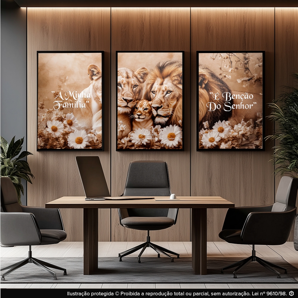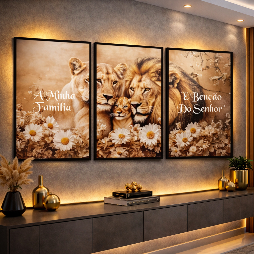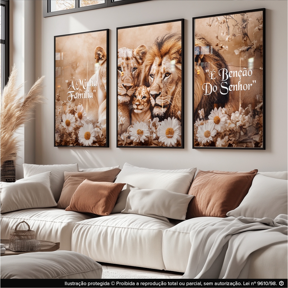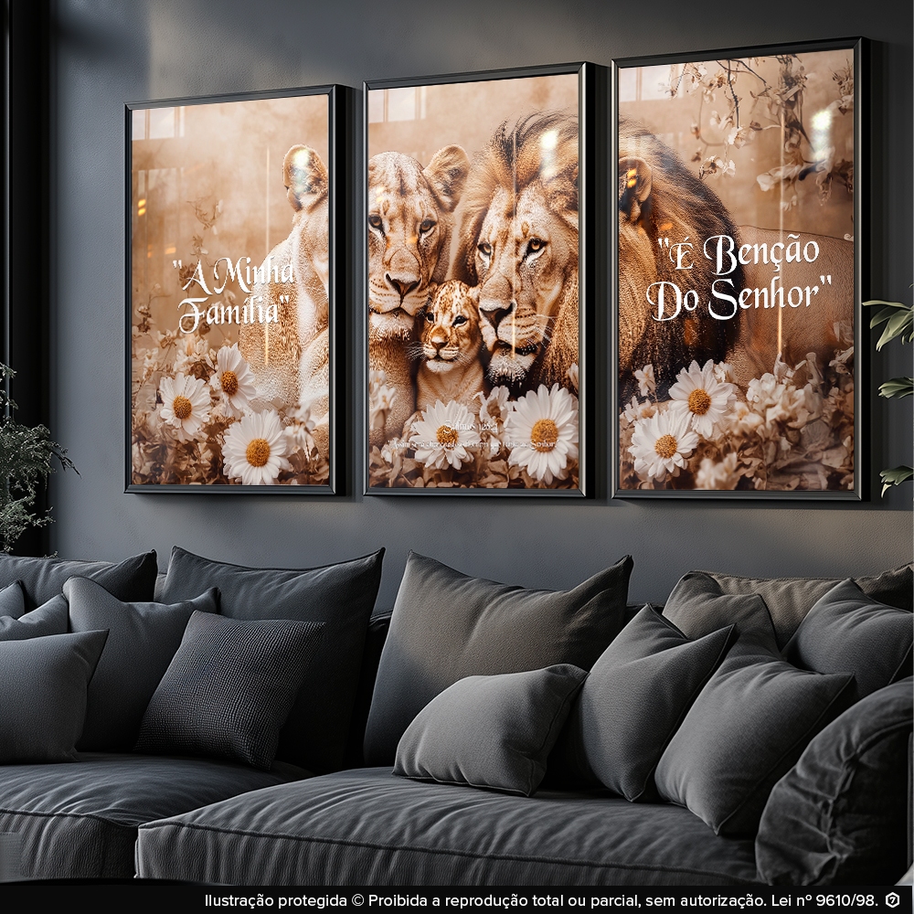 Quadro Decorativo Trio Leões Família Lar Bênçãos Fé Harmonia Religioso Para Quarto Sala
