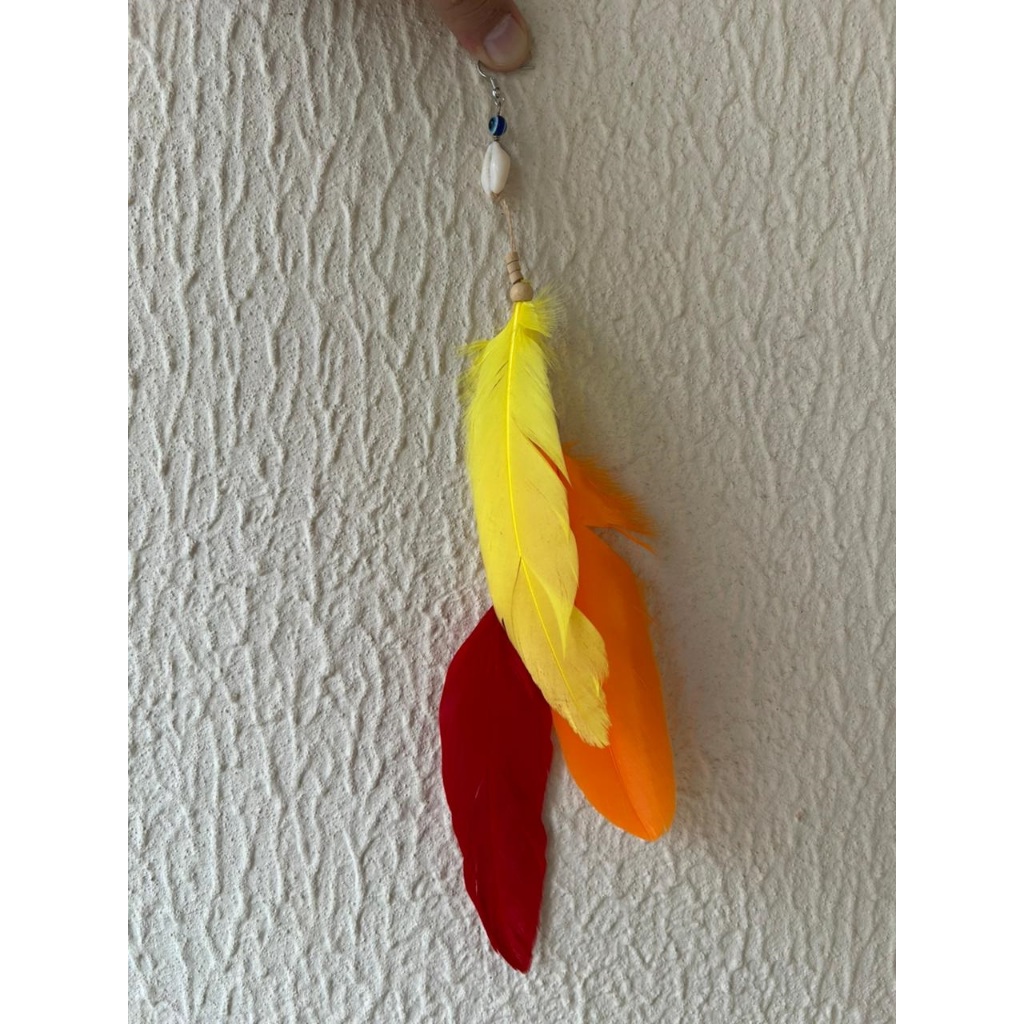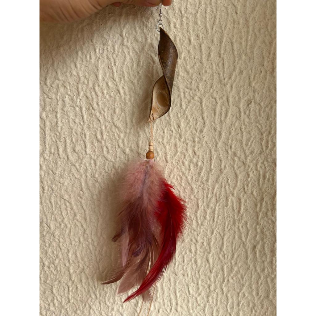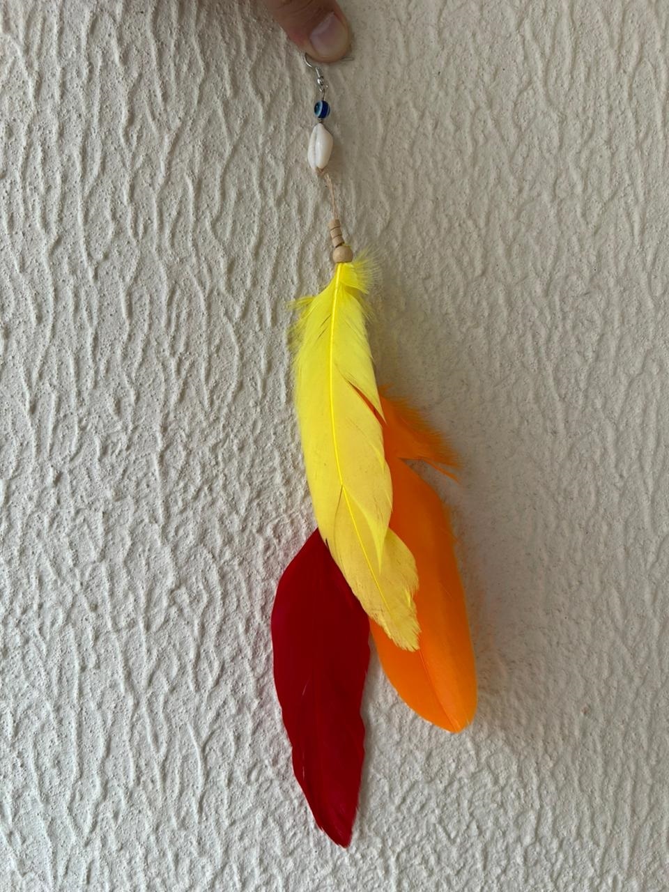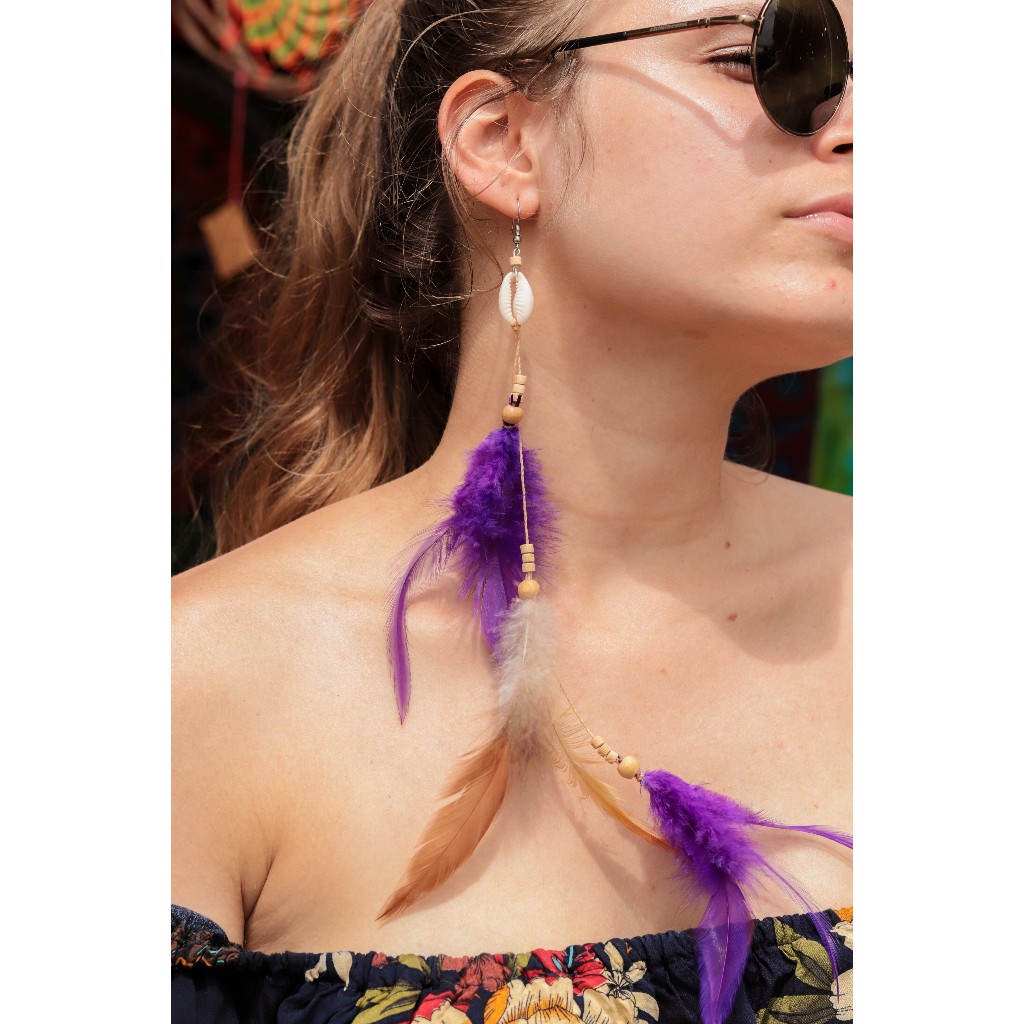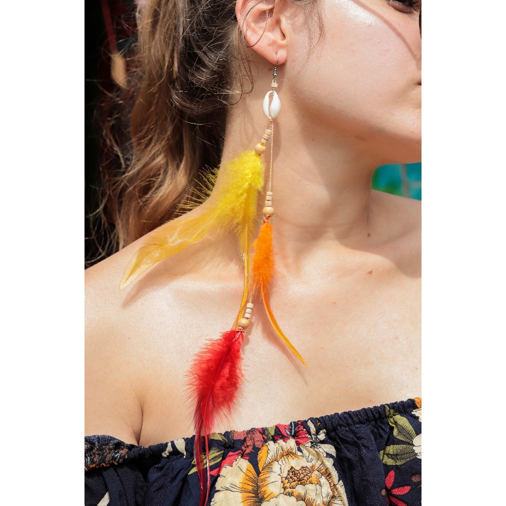 Brinco Longo Artesanal de Concha Búzios com Penas Coloridas – Boho, Hippie e Festival