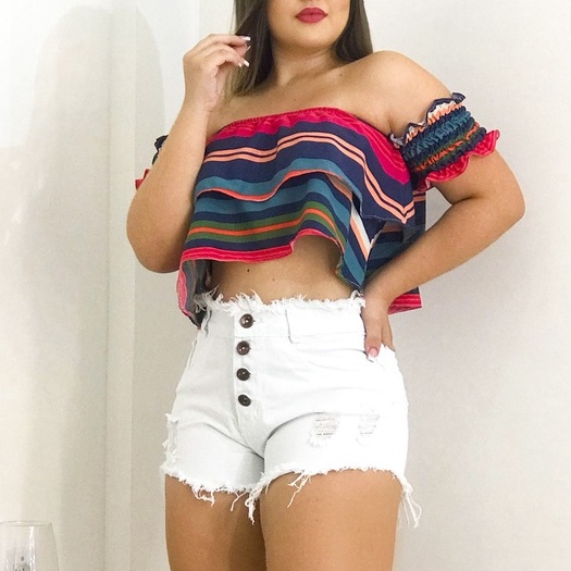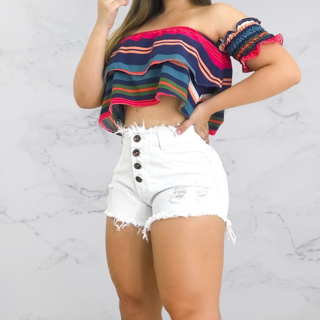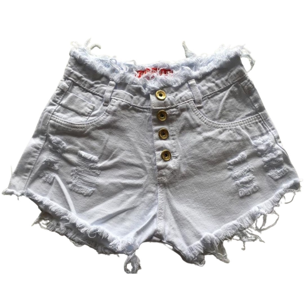 Bermuda Jeans Short Destroyed Feminino Cintura Alta Cós Alto Branco