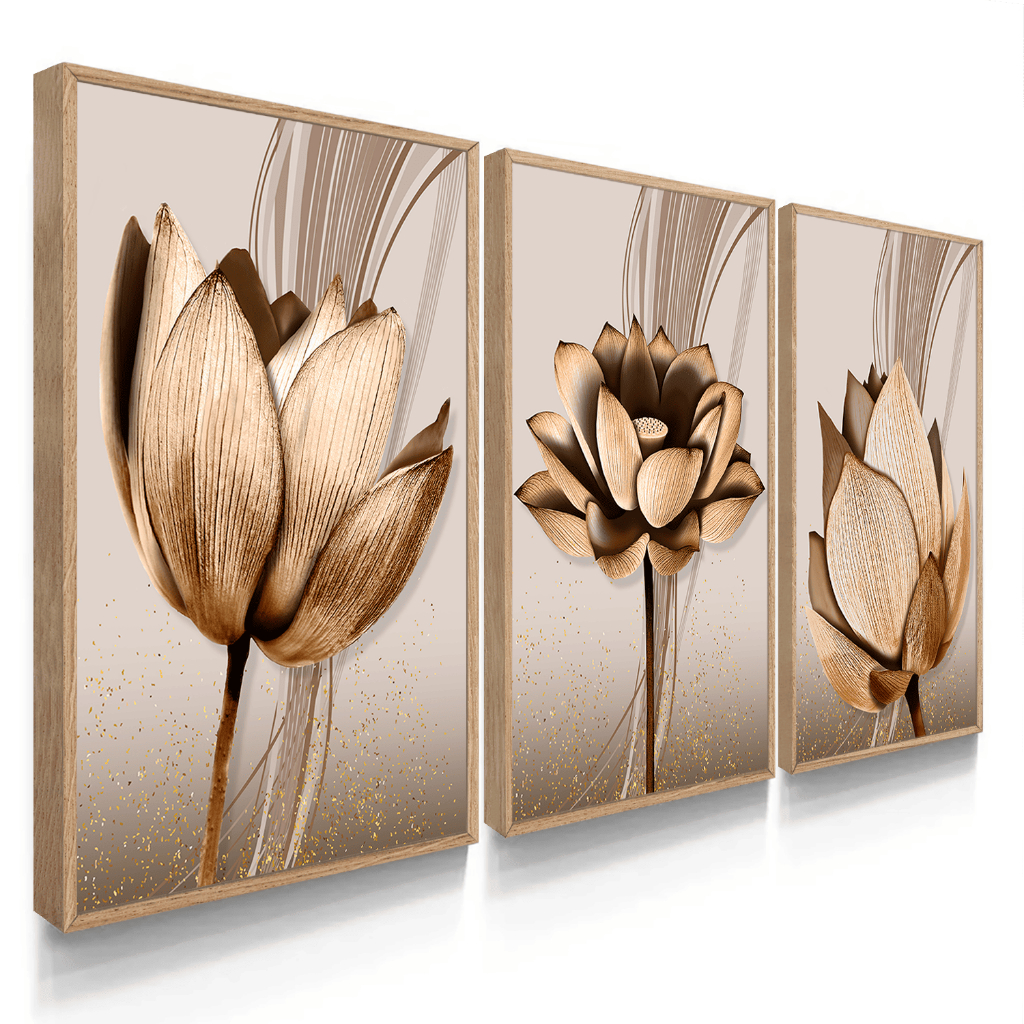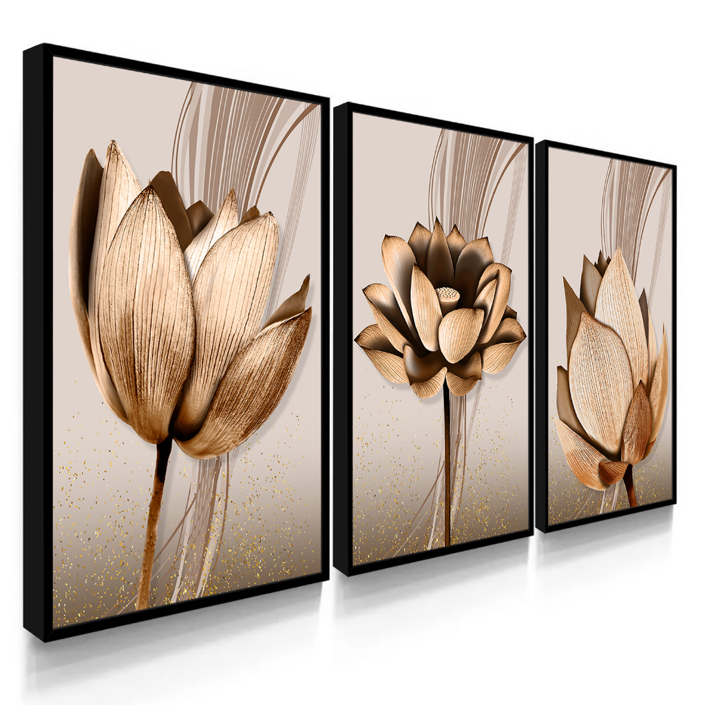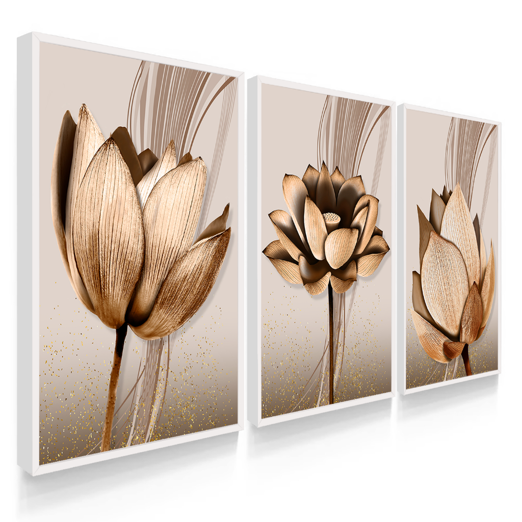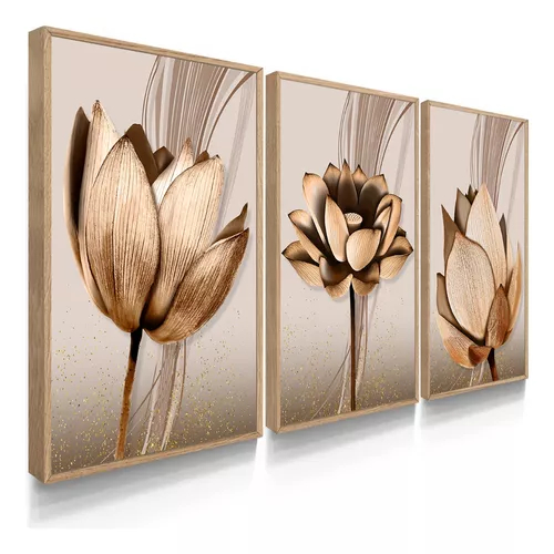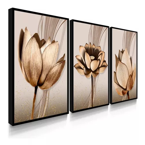 Kit Quadros Decorativos com Moldura Sala Quarto Flores Abstratas Cobre