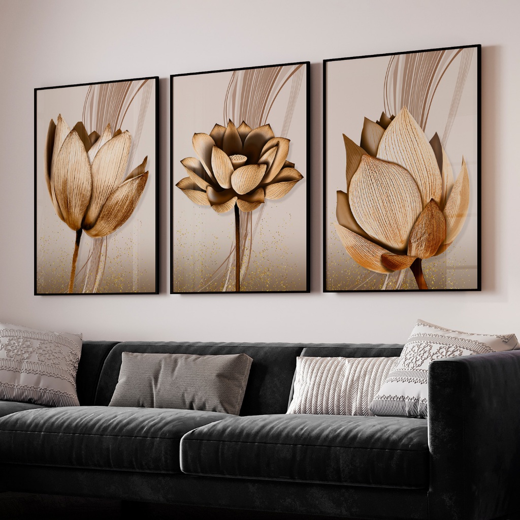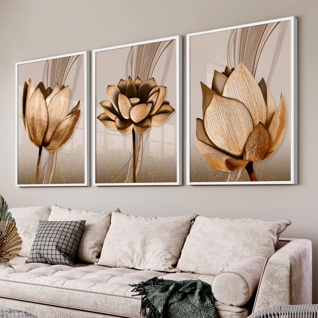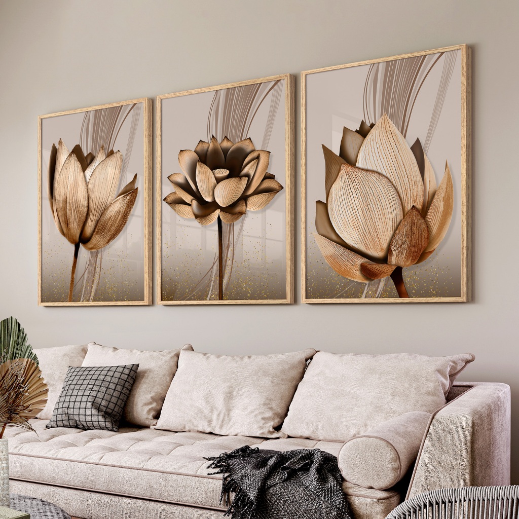 Kit Quadros Decorativos com Moldura Sala Quarto Flores Abstratas Cobre
