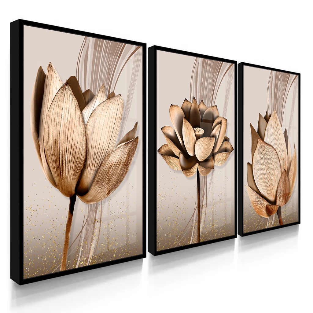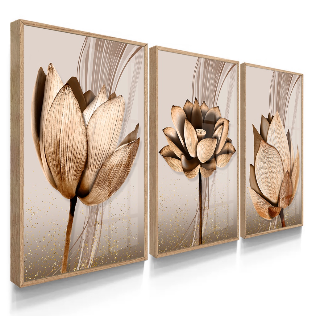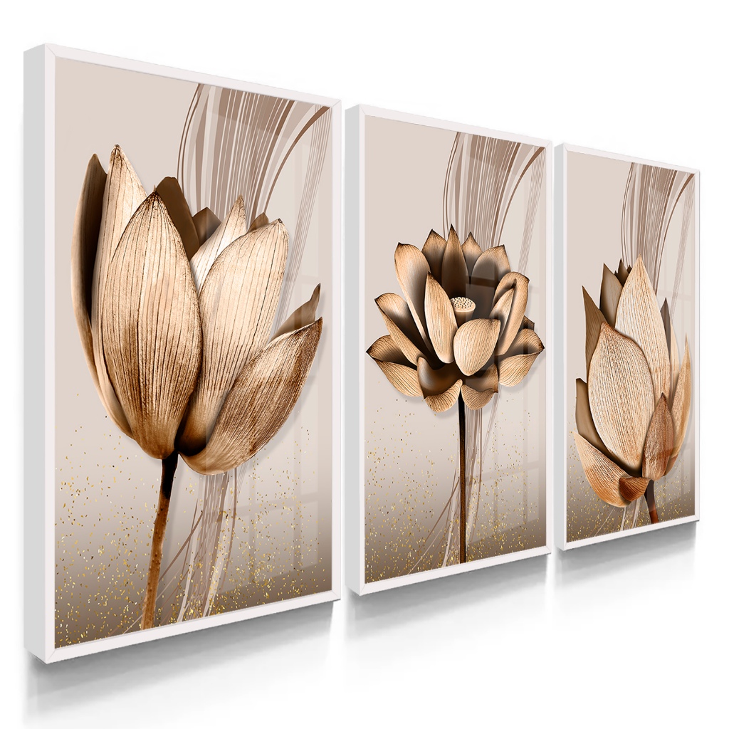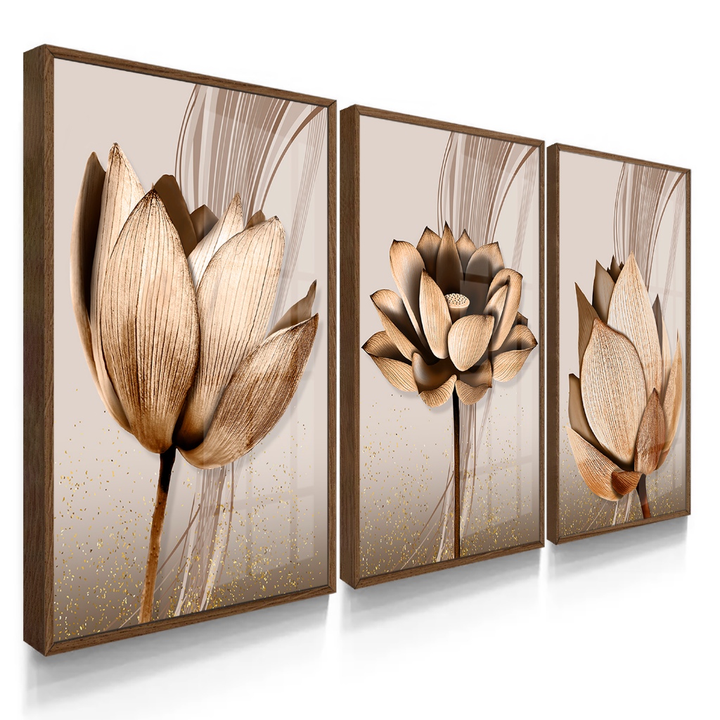 Quadros Decorativos com Moldura e Vidros Flores Cobre Neutro Kit Trio