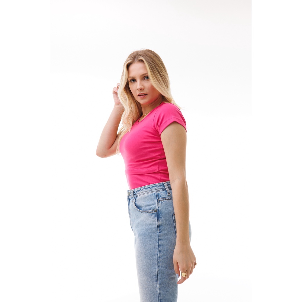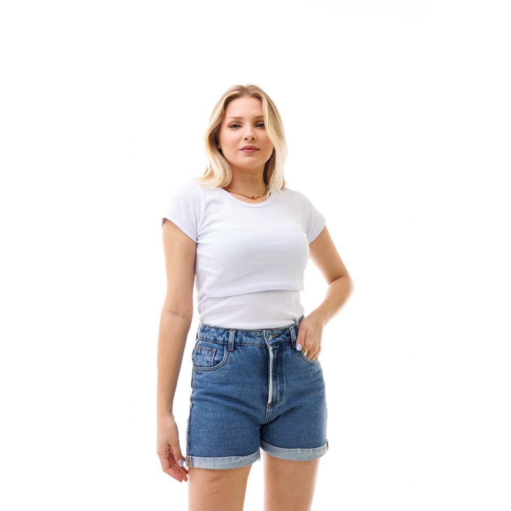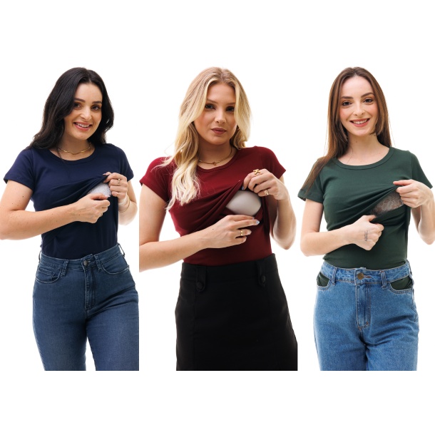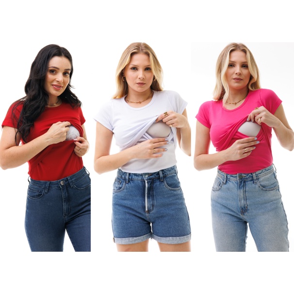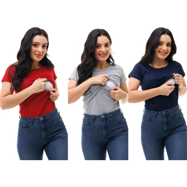 Kit com 3 Camisas de Manga Curta com Gola Redonda e Abertura Para Amamentar - Várias Cores