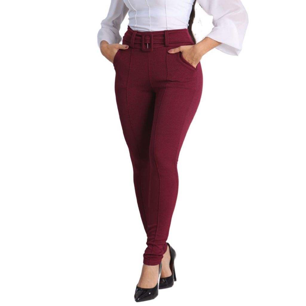 Calça Feminina Crepe Calca Com Cinto Forrado Skinny Cintura Alta Social Bolso
