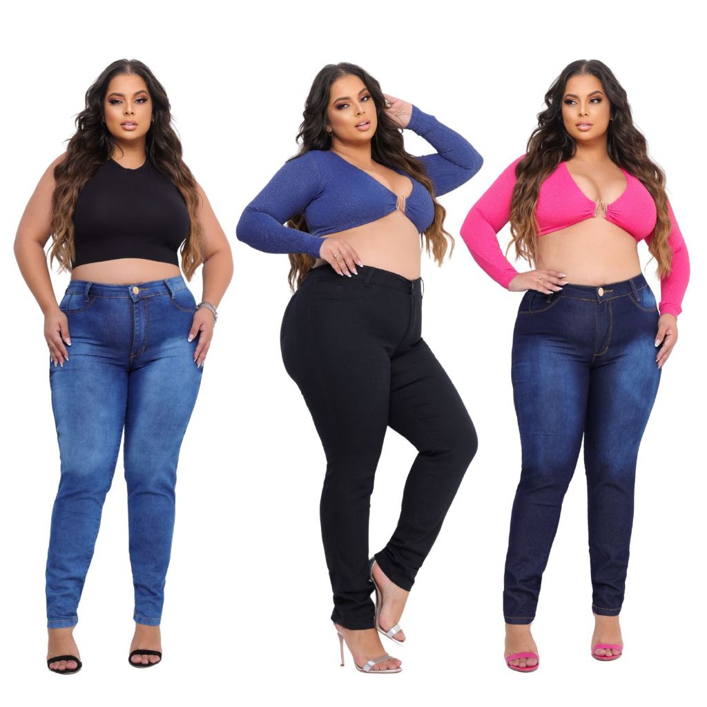 KIT 3 Calça Jeans Feminina Plus Size Cintura Alta Com Lycra Elastano Premium efeito Empina Bumbum Promoção