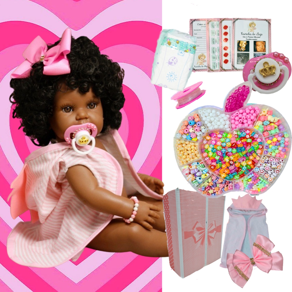 Boneca Bebê Reborn Silicone Realista Negra 1000 Peças Kit Miçangas Completo Pulseiras Envio Imediato