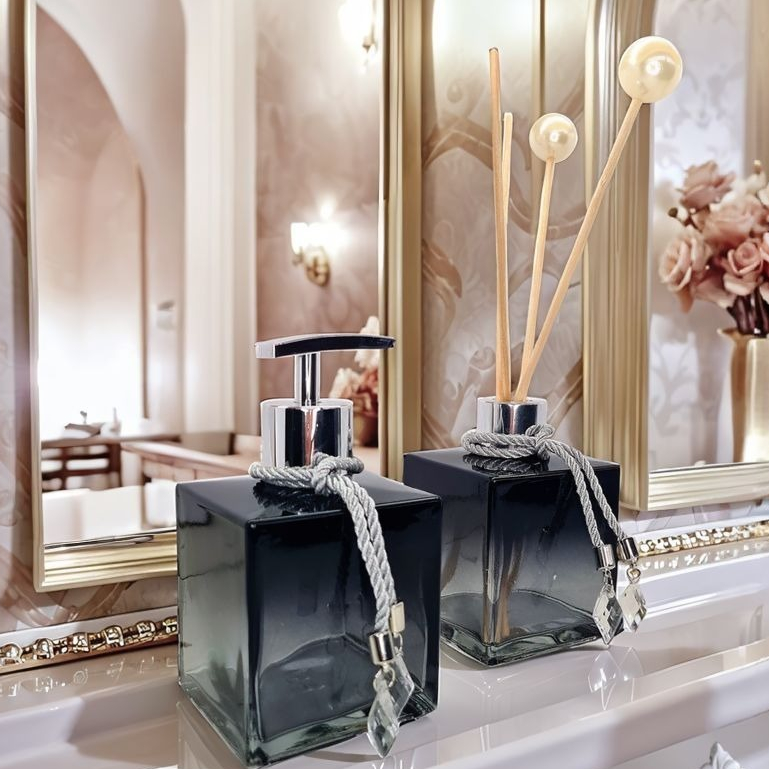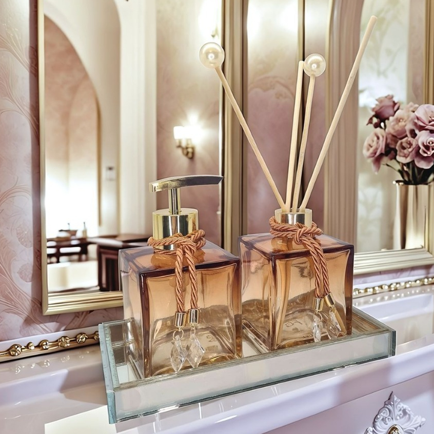 Kit Lavabo Vidro Luxo Com Bandeja Branco Vidro Ambar Banheiro Aroma Difusor