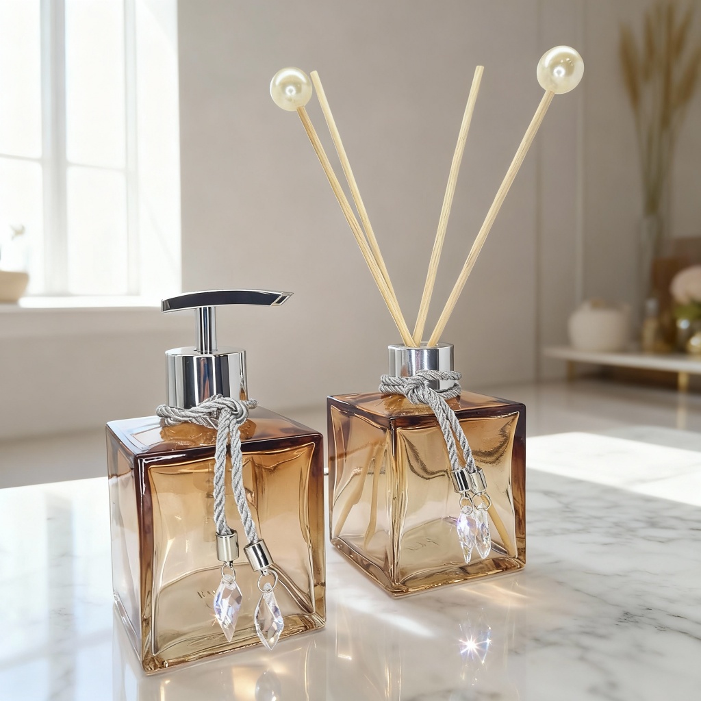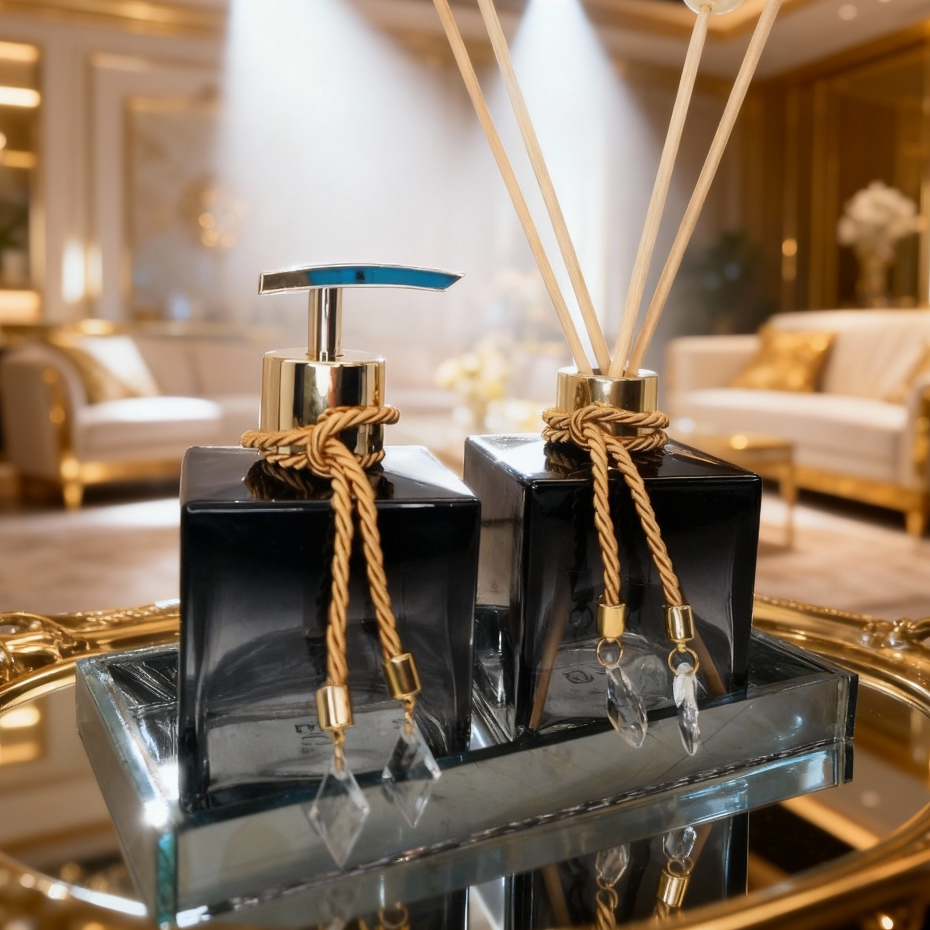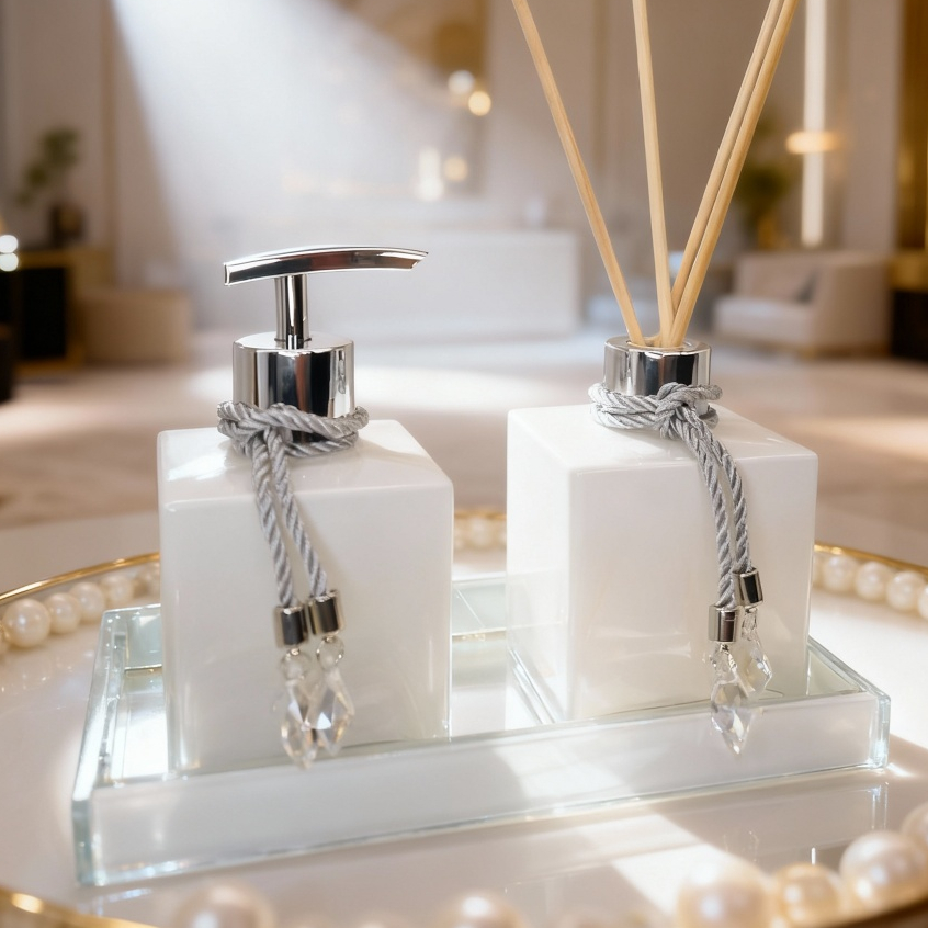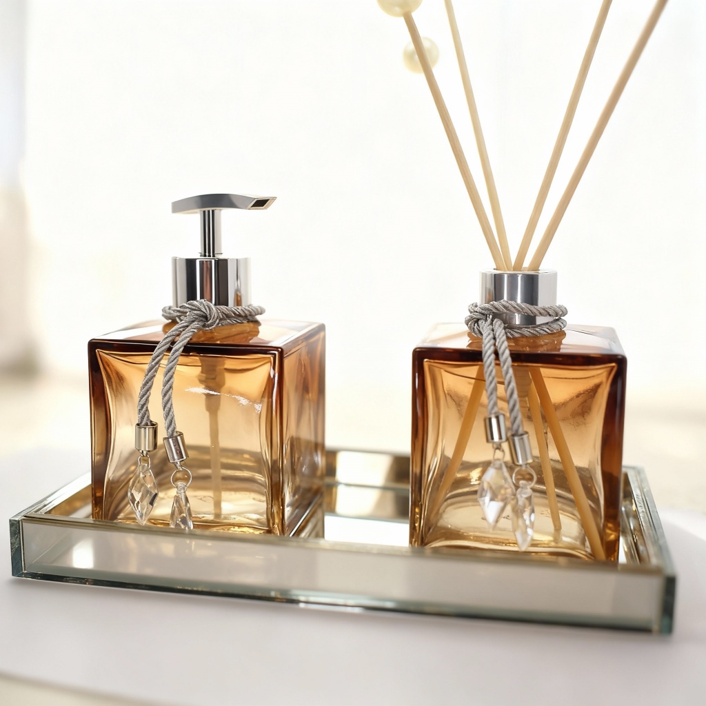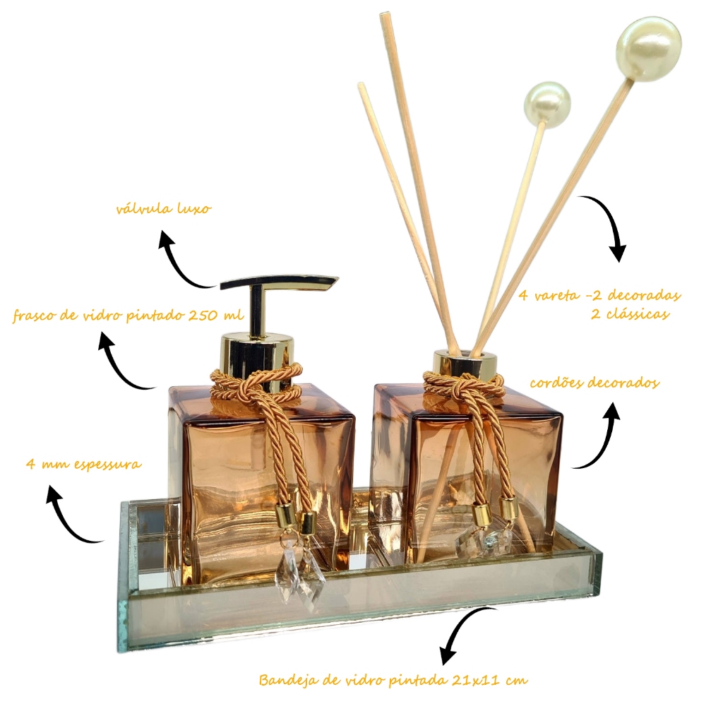 Kit Lavabo Vidro Completo Elegante Bambu Luxo Promoção Ambar Branco Bandeja Presente Chique Elegante