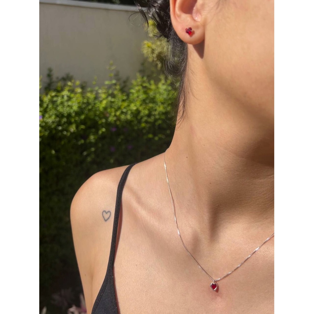 Conjunto Colar + Brincos Coração Vermelho Prata 925 Ponto de Luz 4 mm Veneziana Feminino Presente Namorada