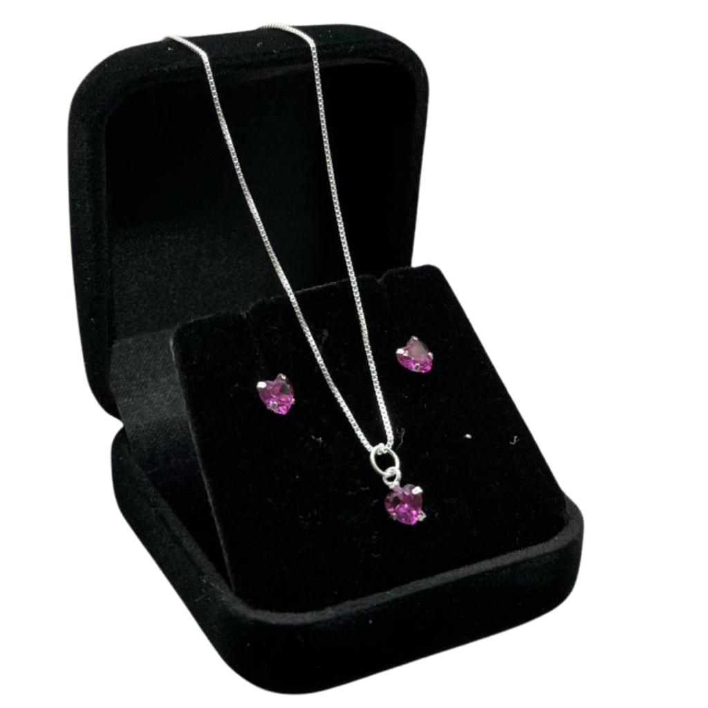 Kit Colar + Brincos Coração Feminino - Várias Cores em Prata 925