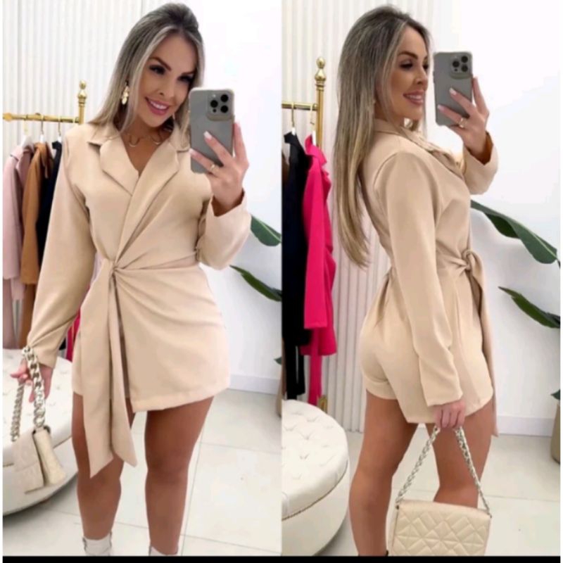 Macacão Macaquinho Inverno Blazer Curto Com Short e Amarração na Lateral Gola V Alfaiataria Luxo moda Feminina