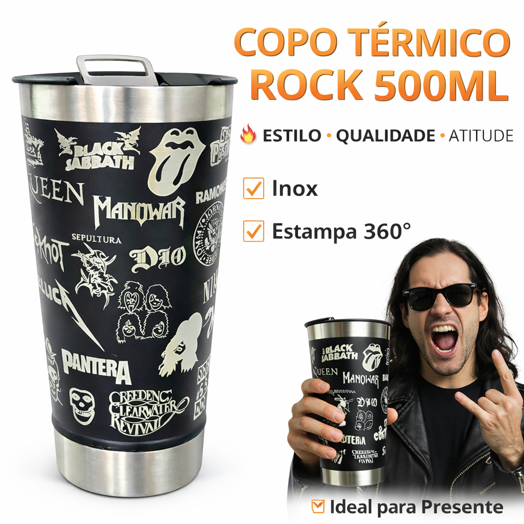 Copo Térmico Rock Inox 500ml – Copo de Bandas Rock 360° | Presente Para Fãs de Rock, Cerveja e Café