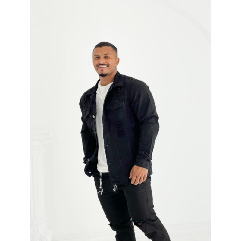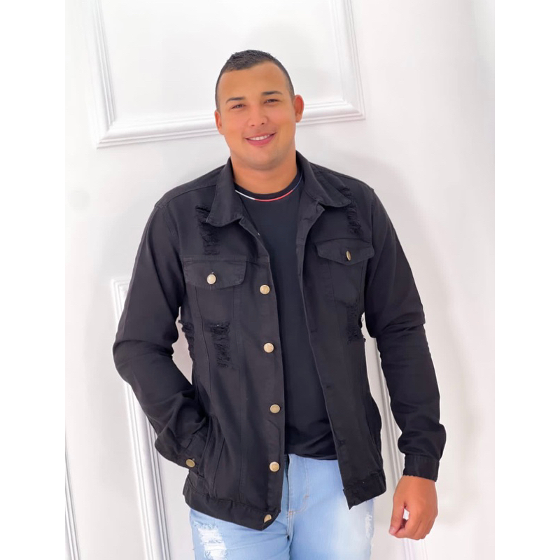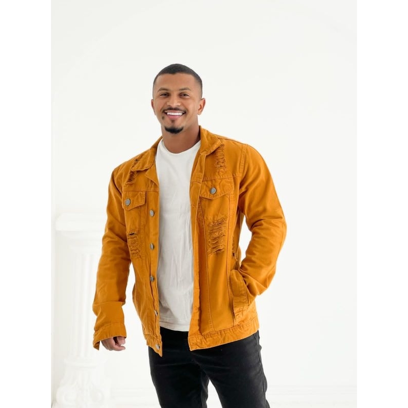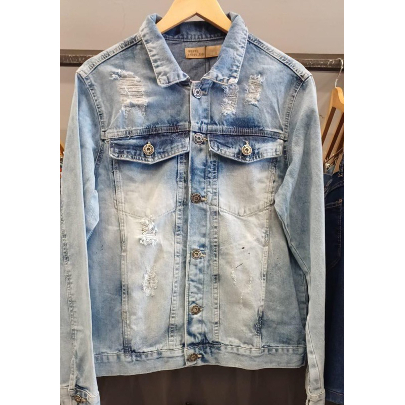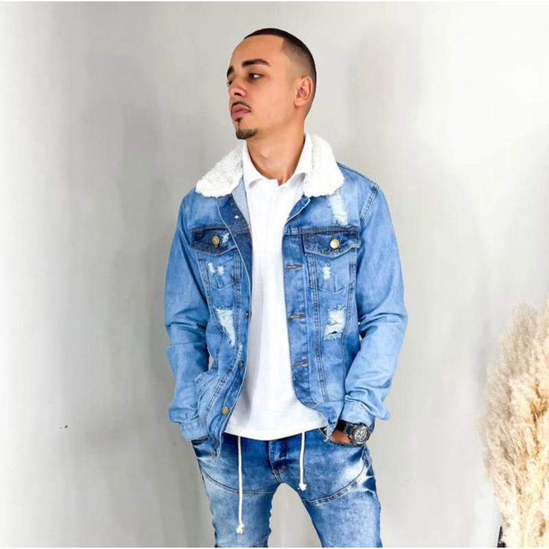 Jaqueta jeans destroyed de pelinho