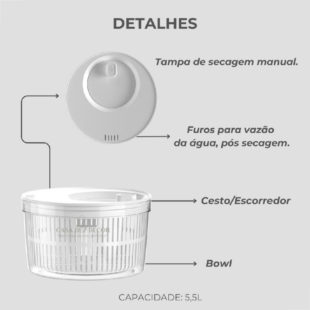 Organizador de Geladeira Secador de Salada Giratório Centrifuga Ou 5,5l Tampa Acrílico Manual Ou