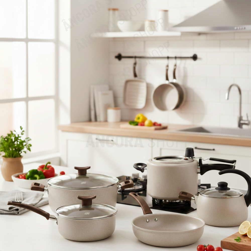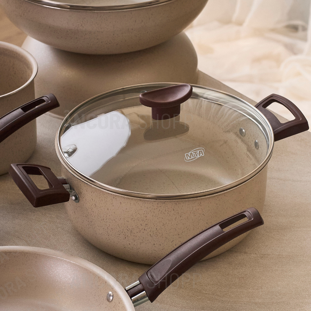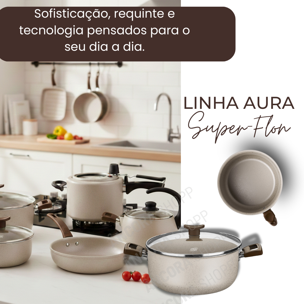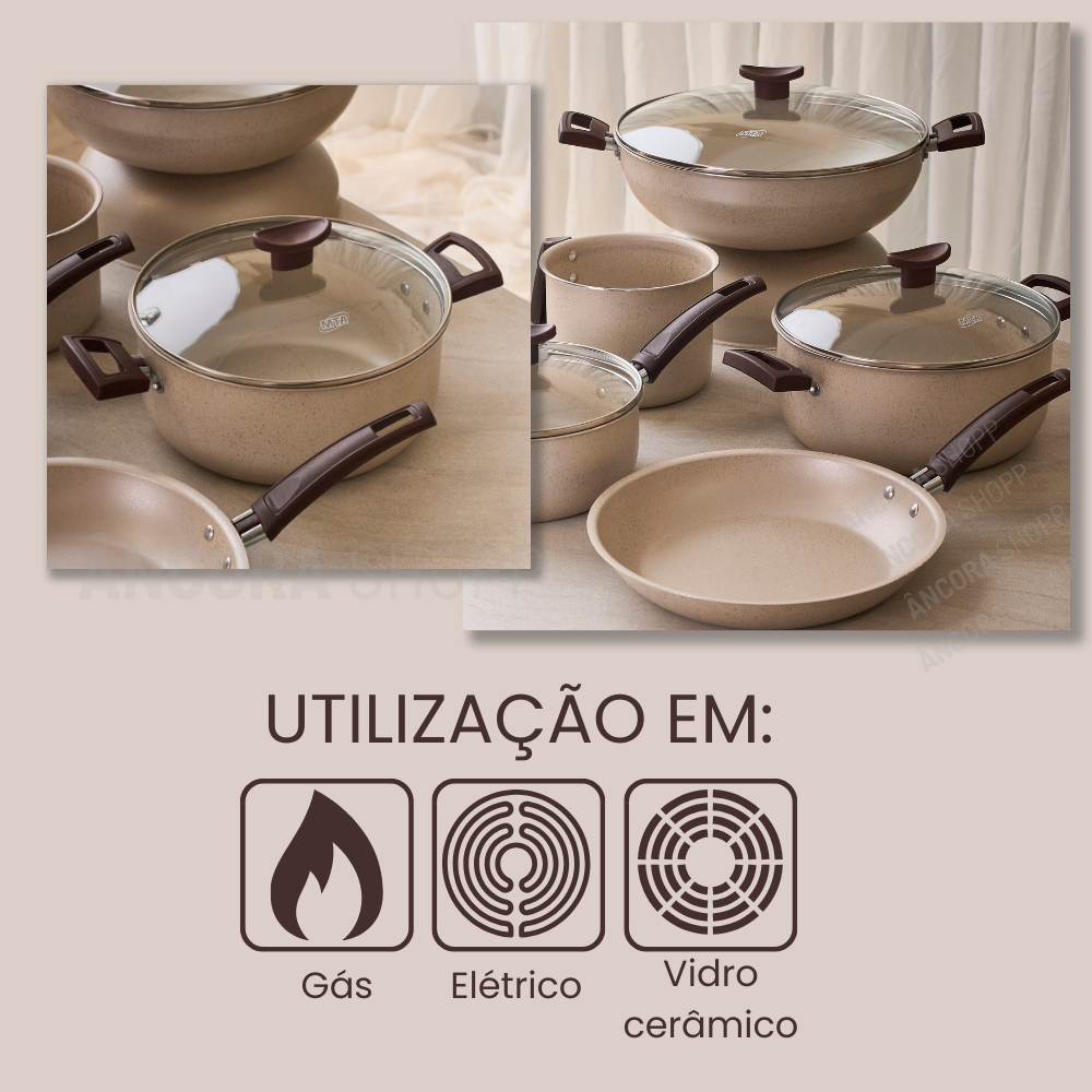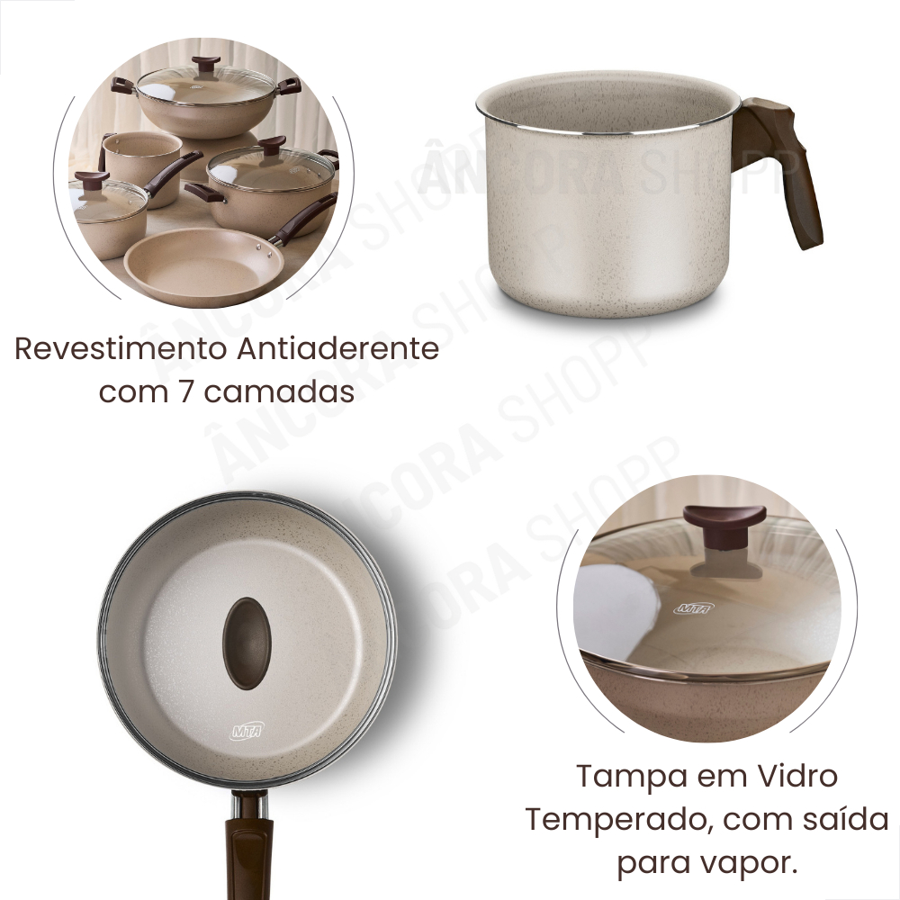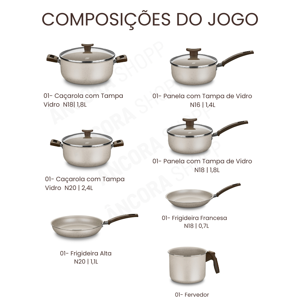 Kit Jogo 7 Panelas com Tampa de Vidro Baunilha MTA Frigideira + Panela + Leiteira Conjunto Cozinha