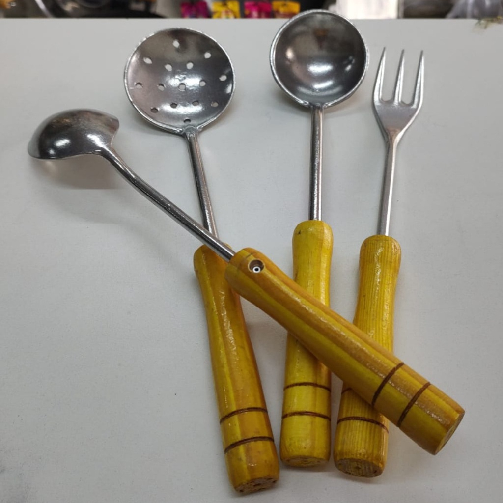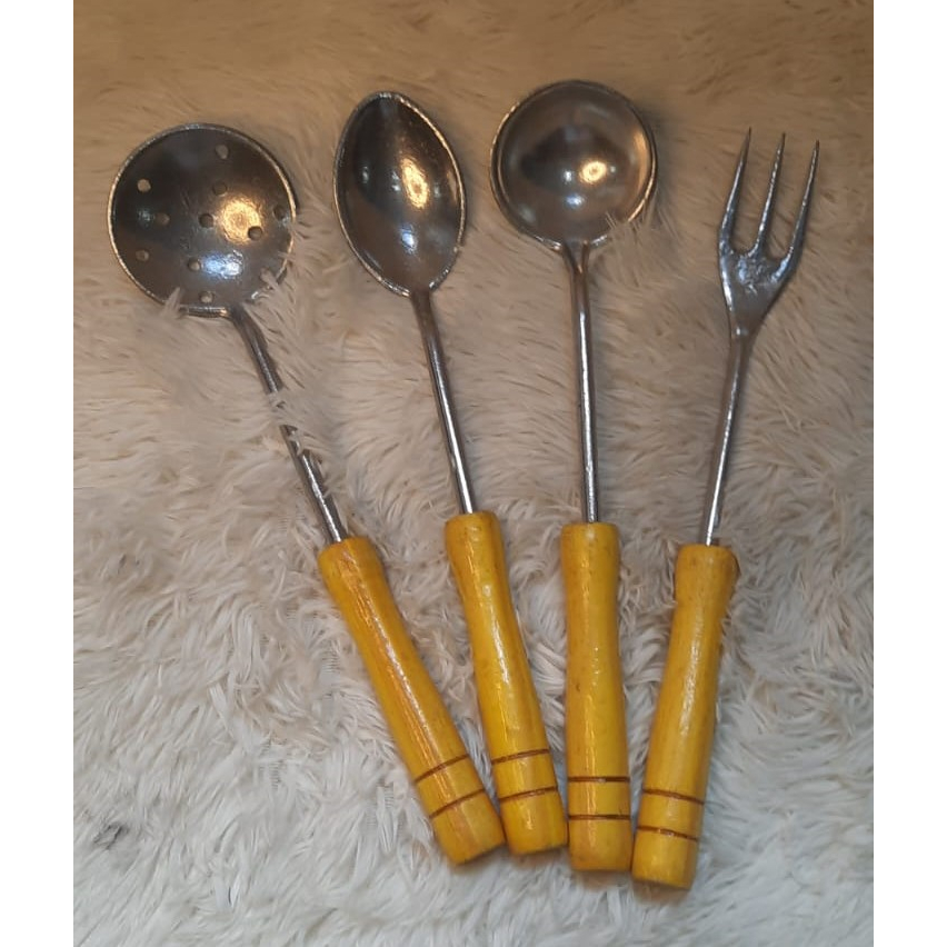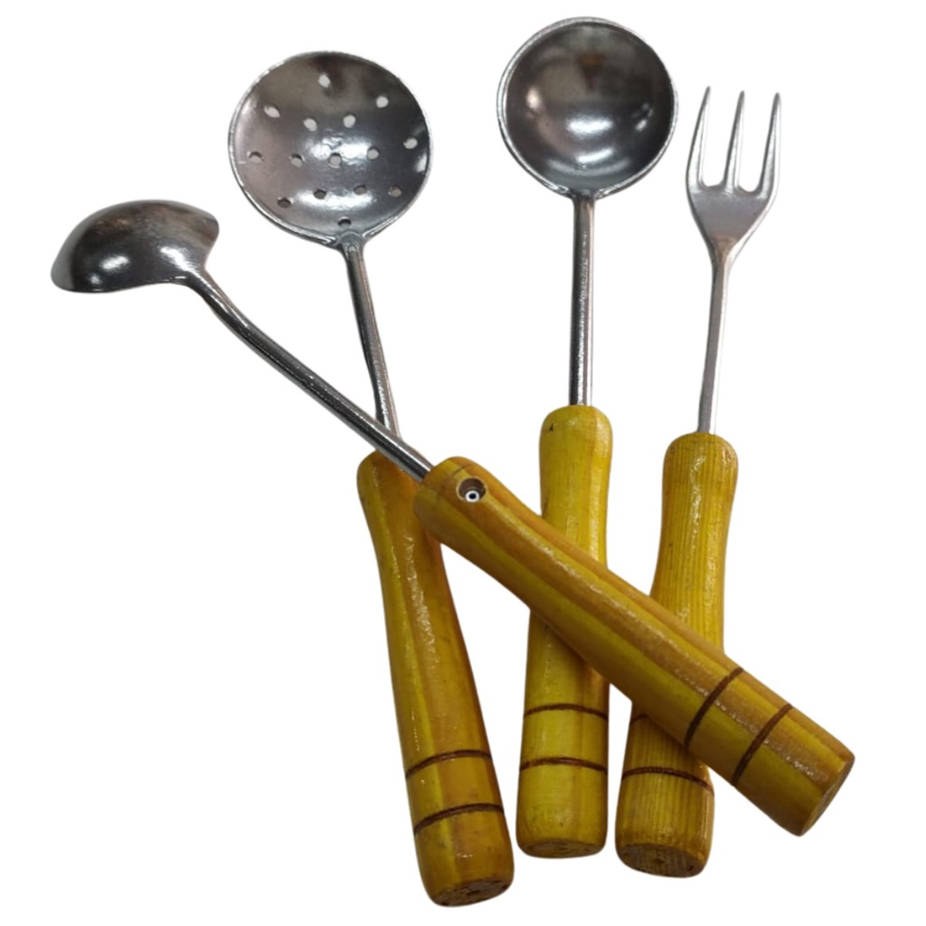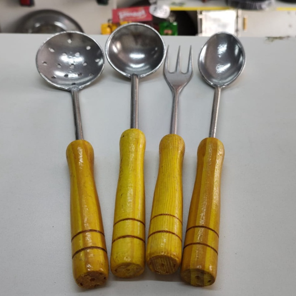 Kit 4 em 1 colher, concha, escumadeira,garfo em alumínio fundido e cabo de madeira restaruante cozinha, hotel, utensil