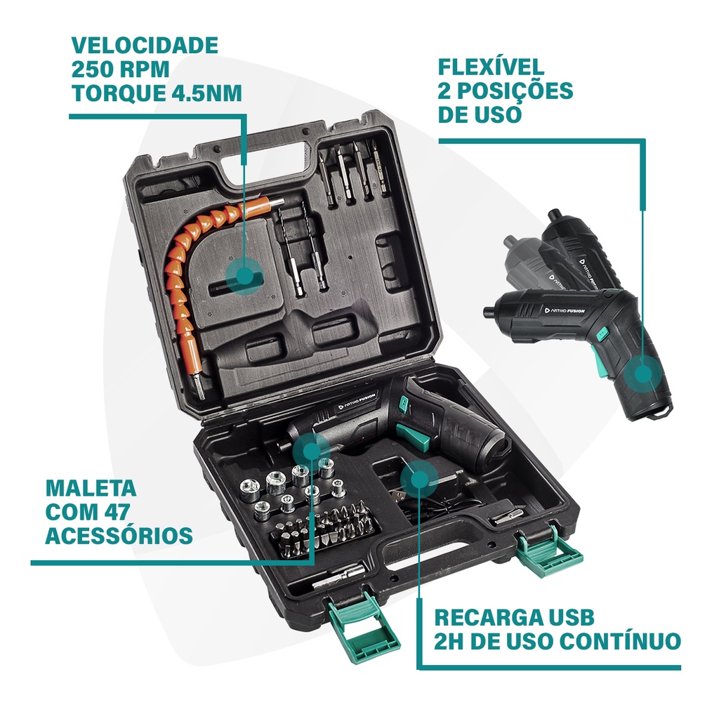 Parafusadeira A Bateria Sem Fio Usb Artiko Fusion Com Maleta 47 Peças Bivolt