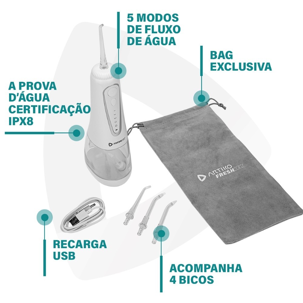 Irrigador Oral Dental Jato De Água Limpeza Bucal Artiko Fresh Jet Portátil Recarregável 4 Bicos