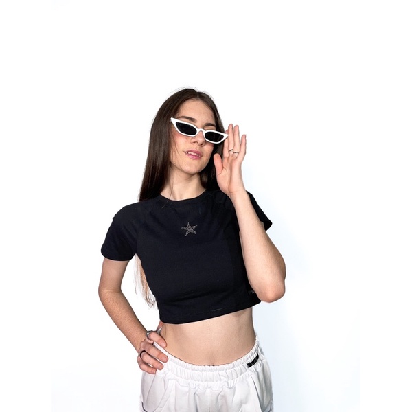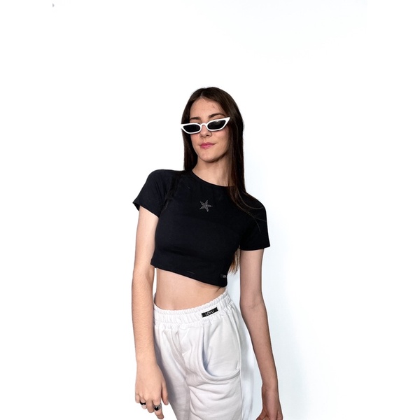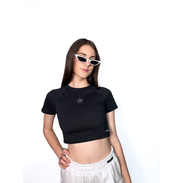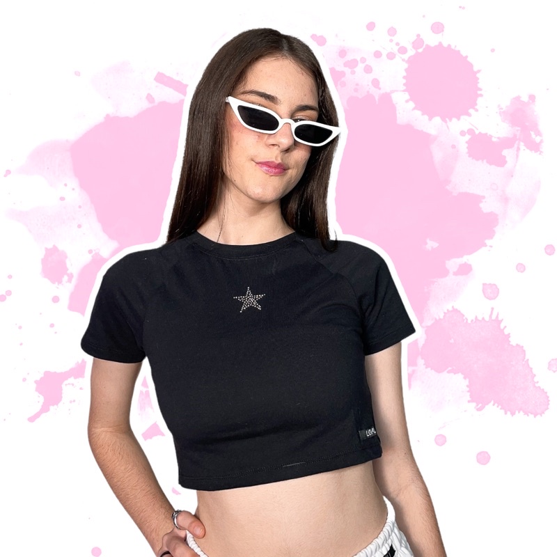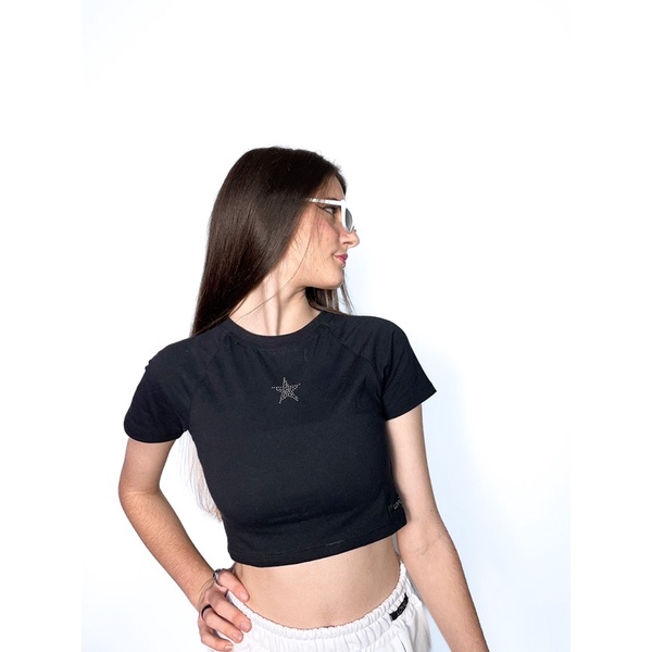 Cropped Star 2000s Preto Raglan Estrela de Strass Y2k Basico