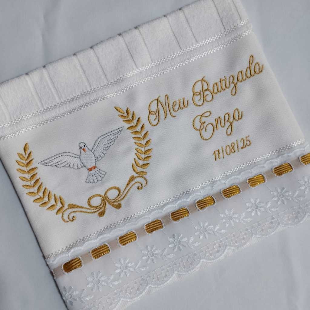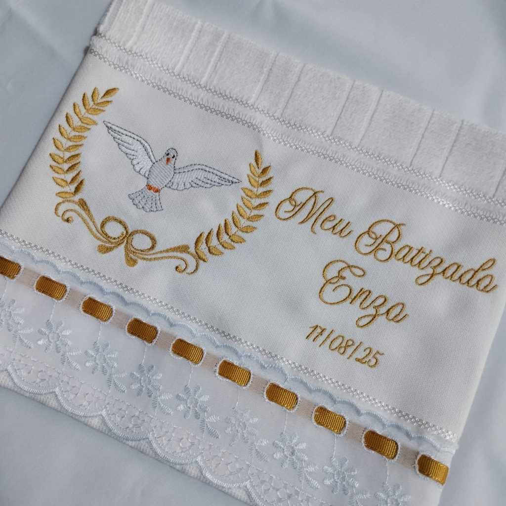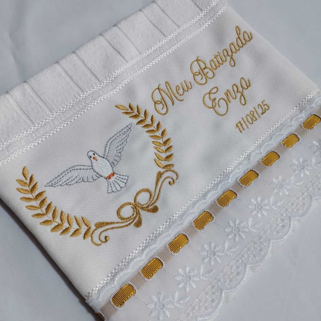 Toalha Toalhinha Branca Bordada Espirito Santo Para Batizado Personalizada Nome Data Renda e Fita