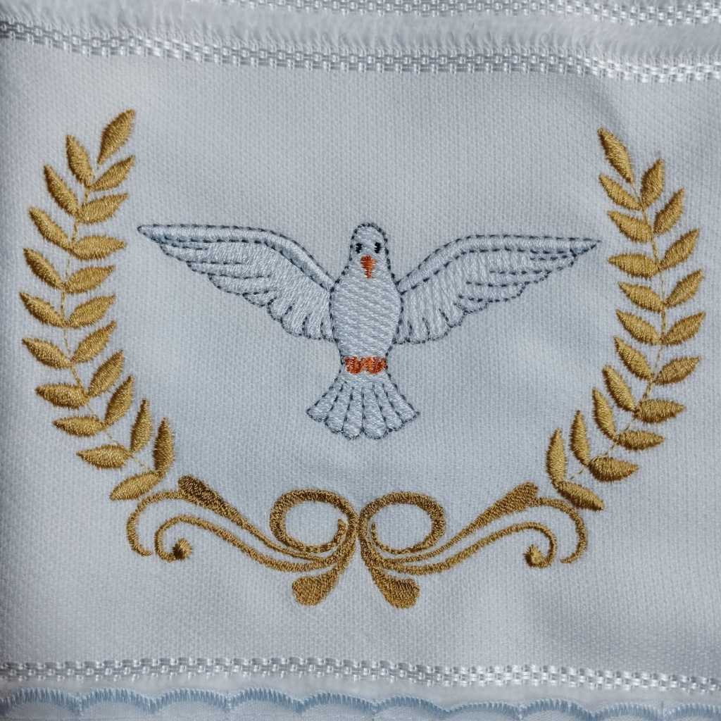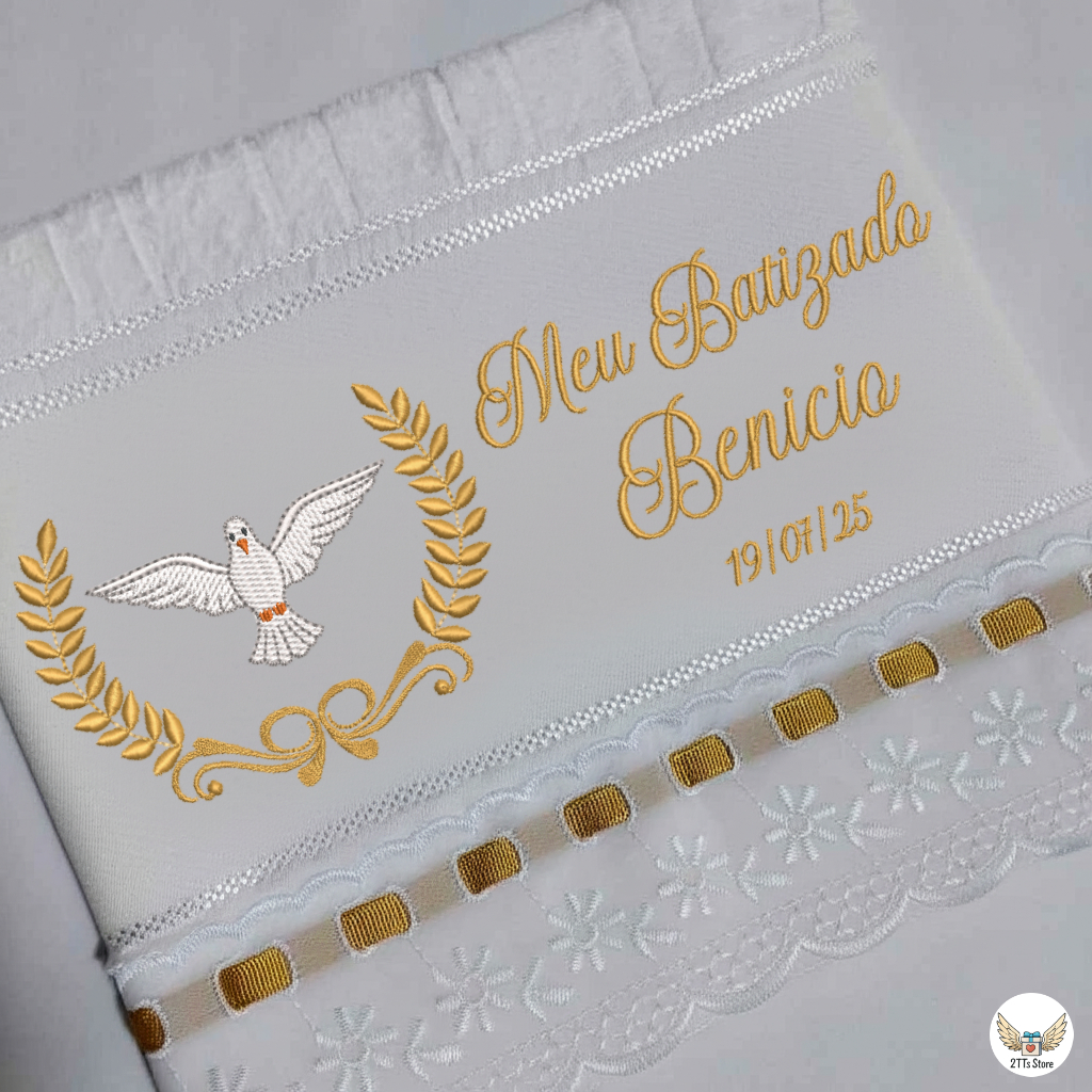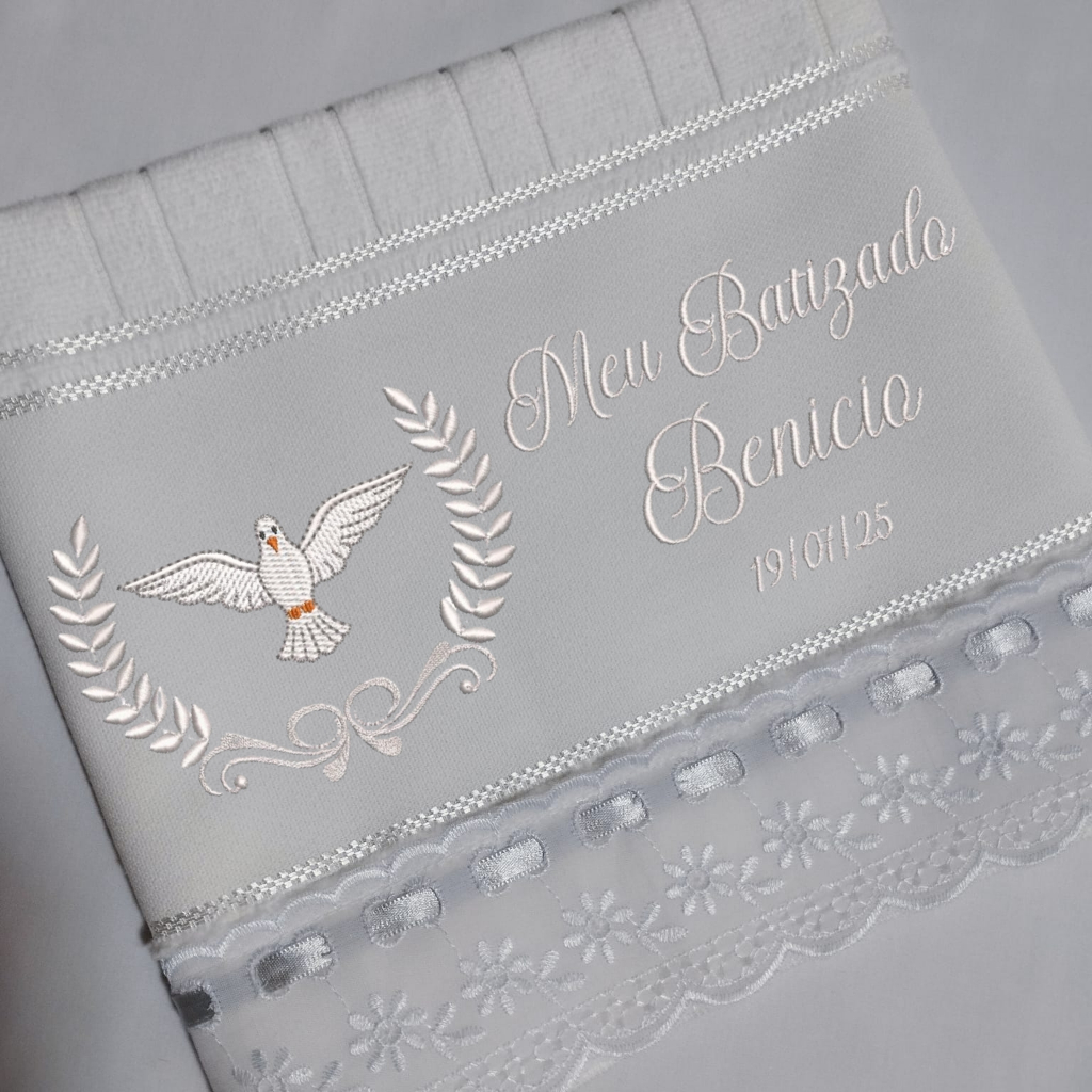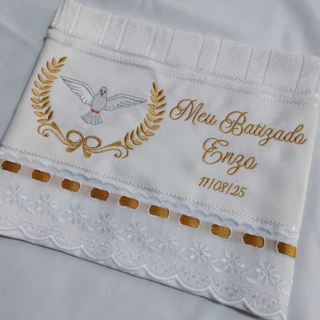 Toalha Toalhinha Branca Bordada Espirito Santo Para Batizado Personalizada Nome Data Renda e Fita