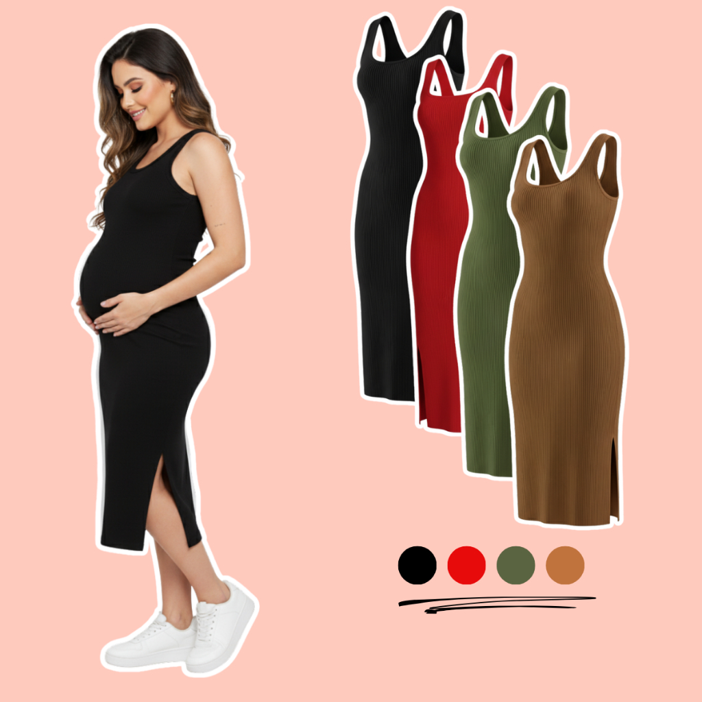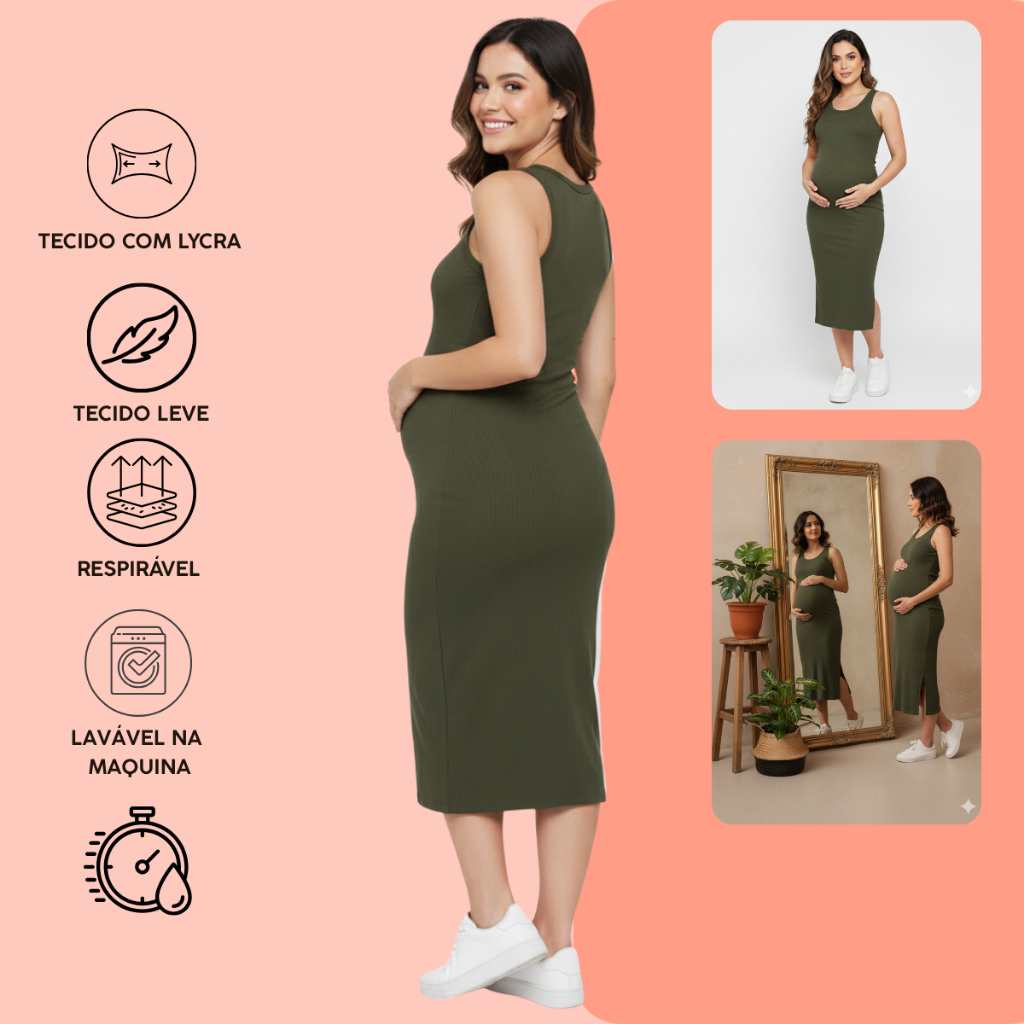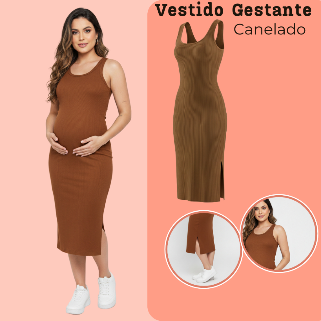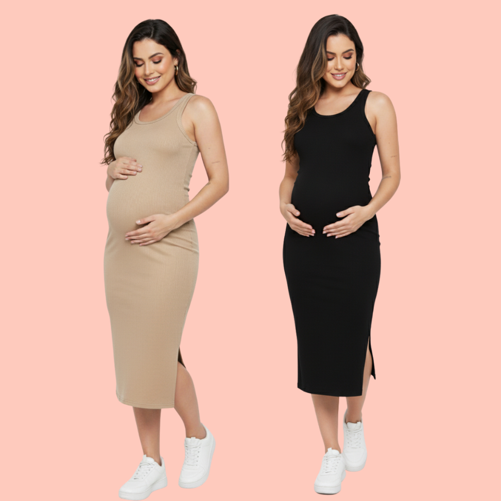 Kit 2 Vestido Gestante Canelado Midi Com Fenda Lateral