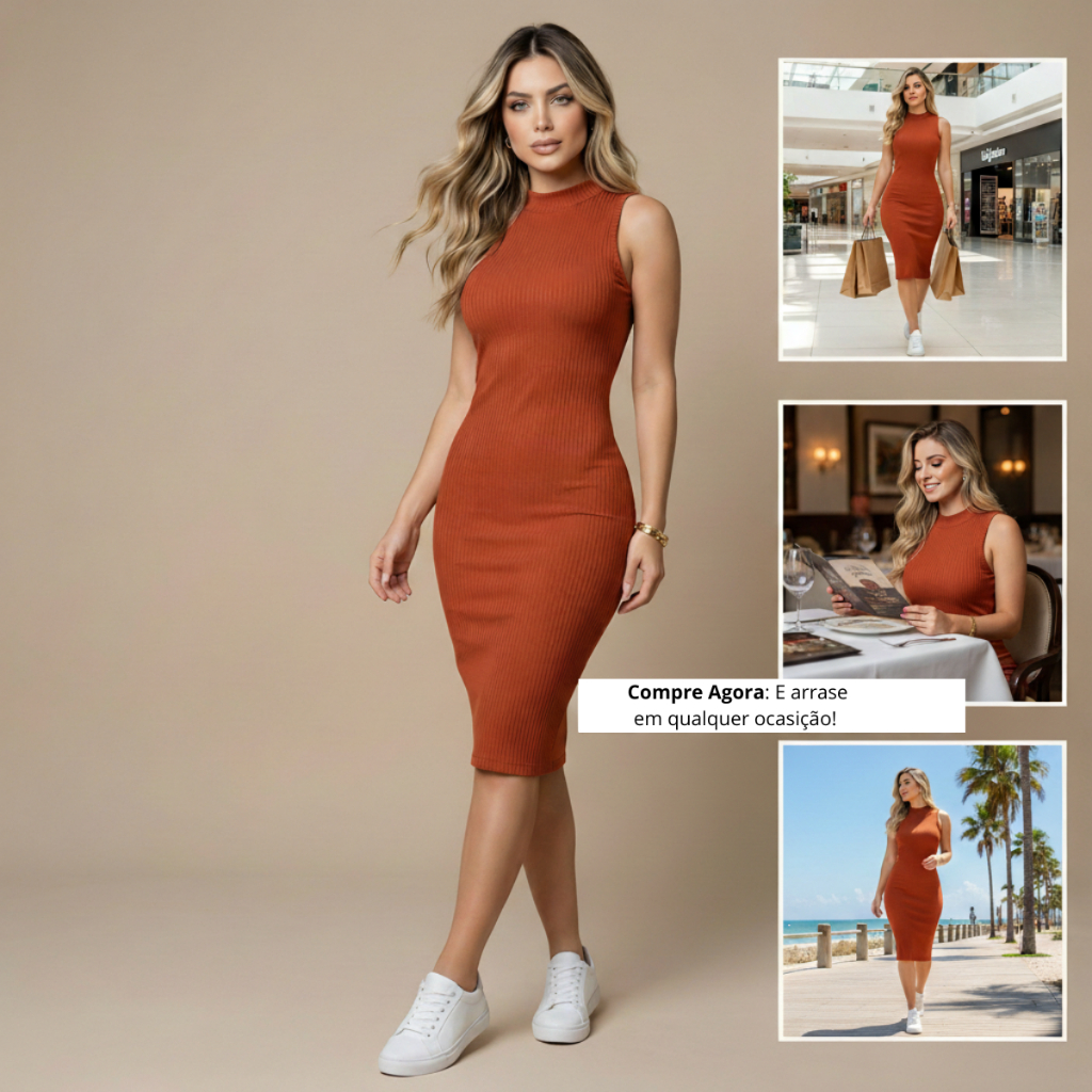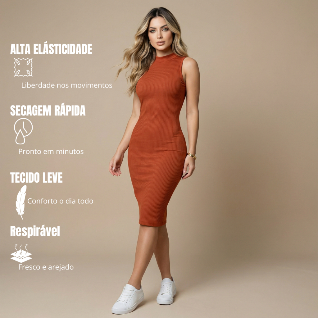 Vestido Midi Tubinho Regata Canelado Gola Alta