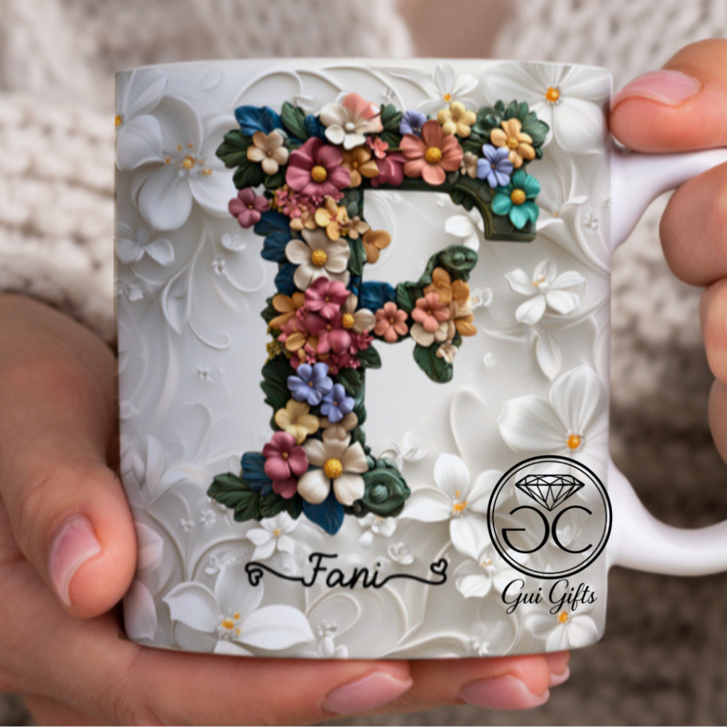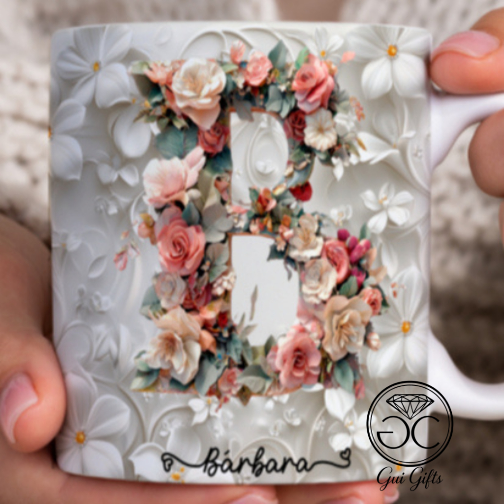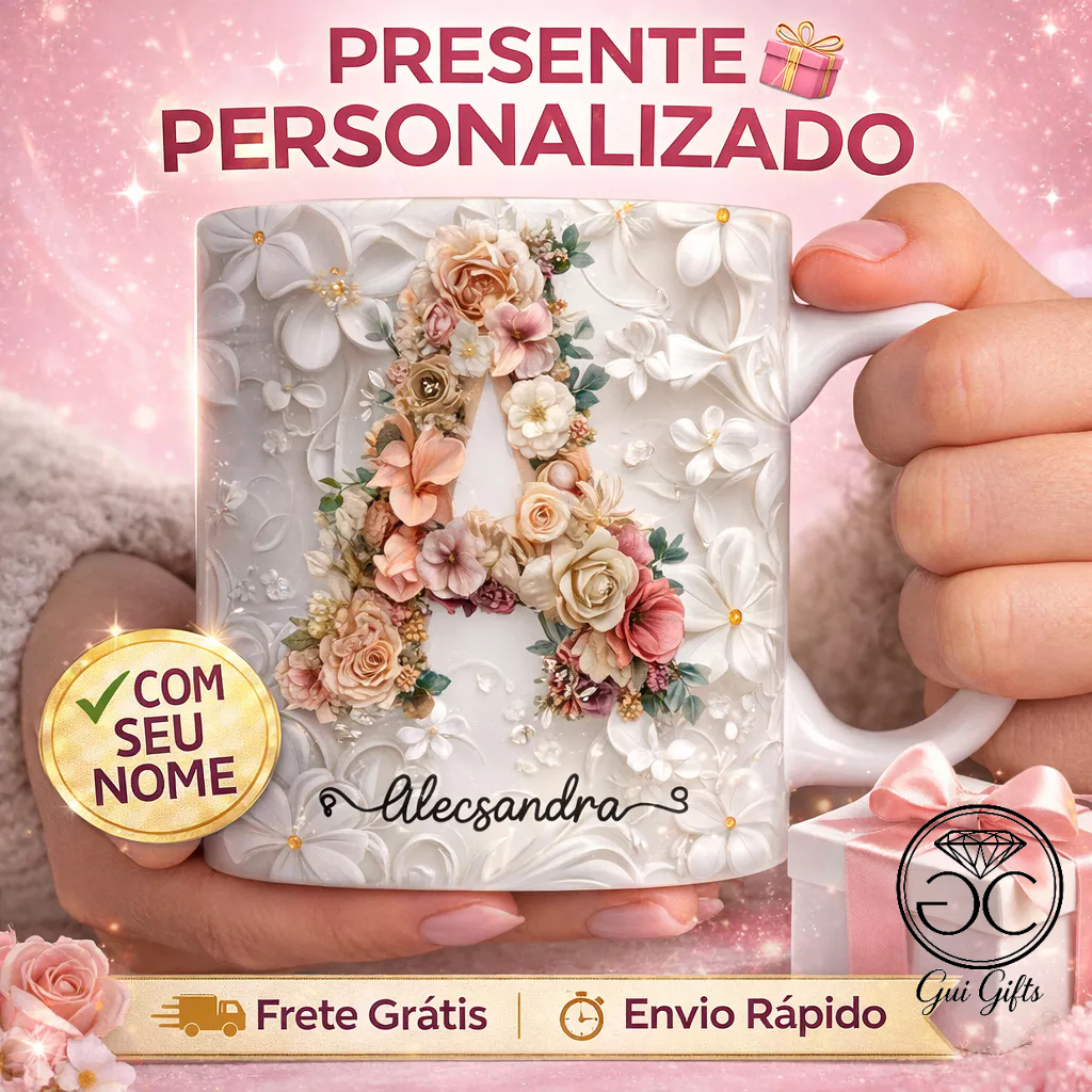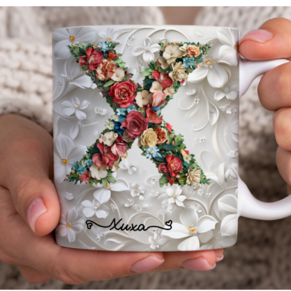 Caneca Xícara Personalizada com Seu Nome Letra Floral Presente Criativo Porcelana 325ml