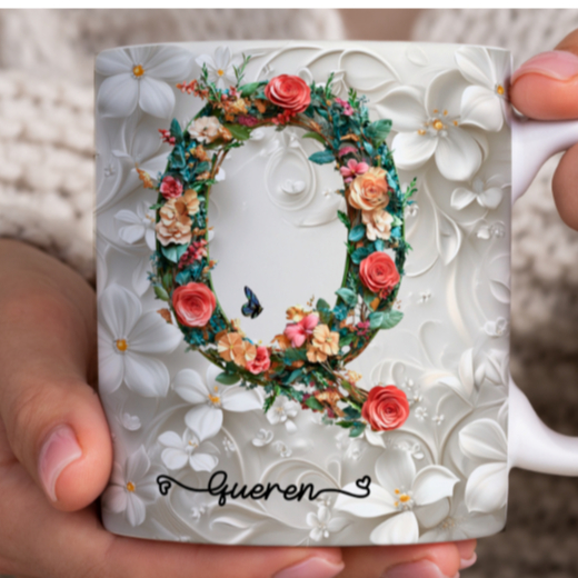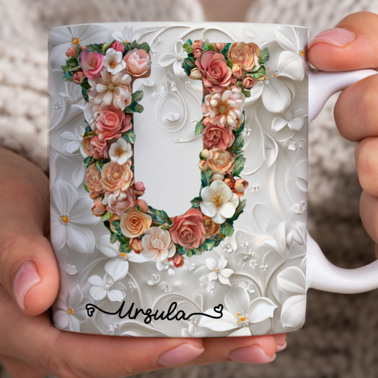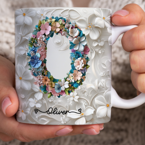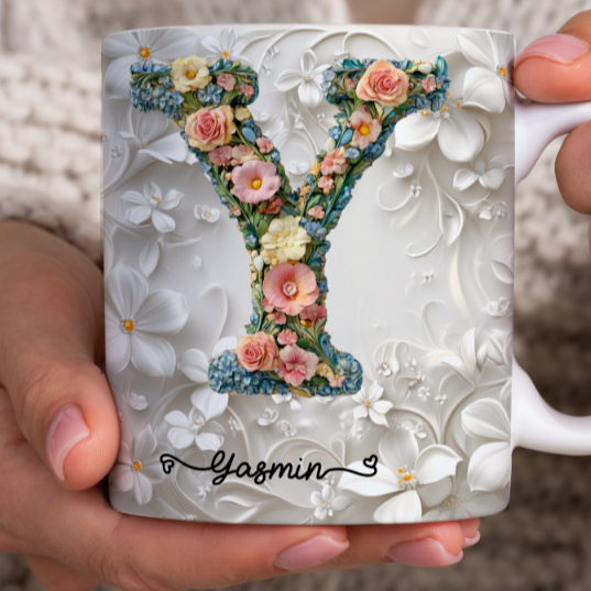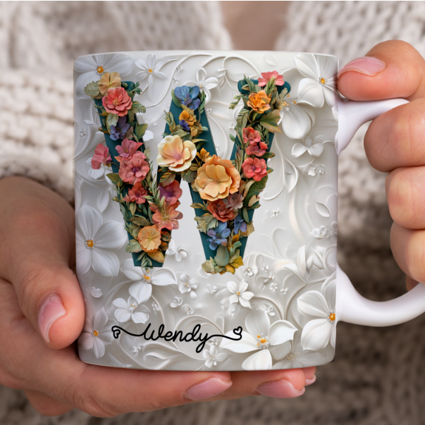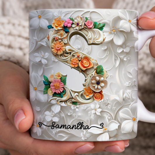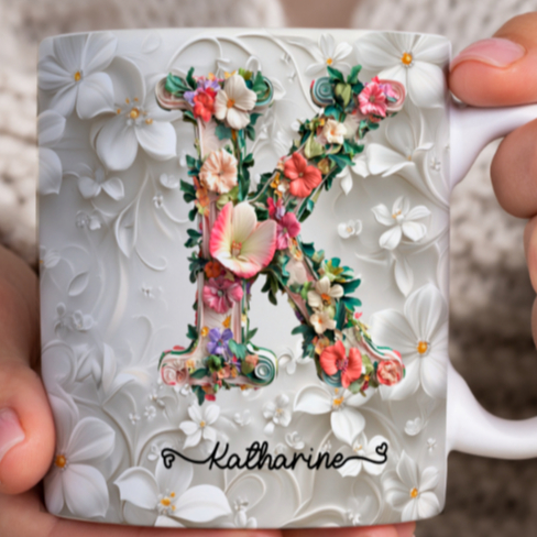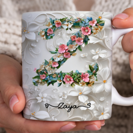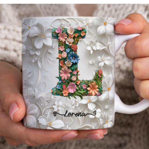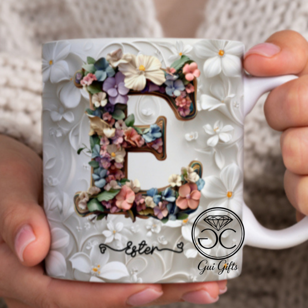 Caneca Xícara Personalizada com Seu Nome Letra Floral Presente Criativo Porcelana 325ml