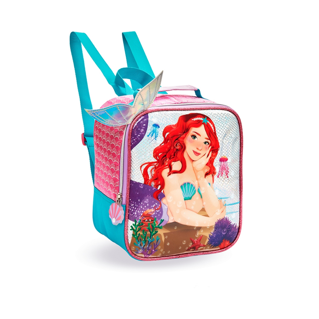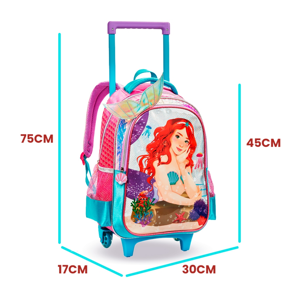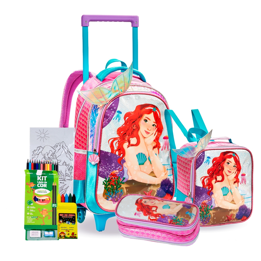 Kit Denlex Mochila Rodinhas Estojo Box e Lancheira Térmica Escolar Linha Sereia Coleção Oceano 2025
