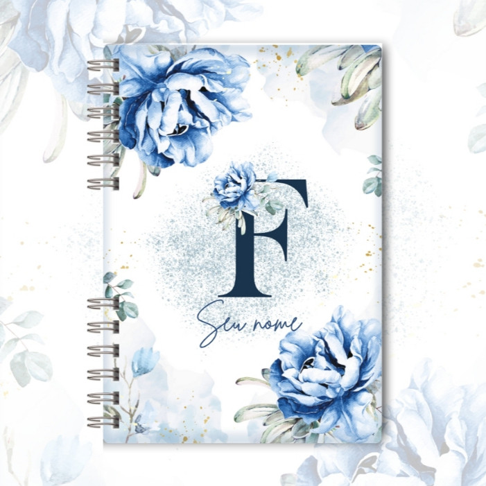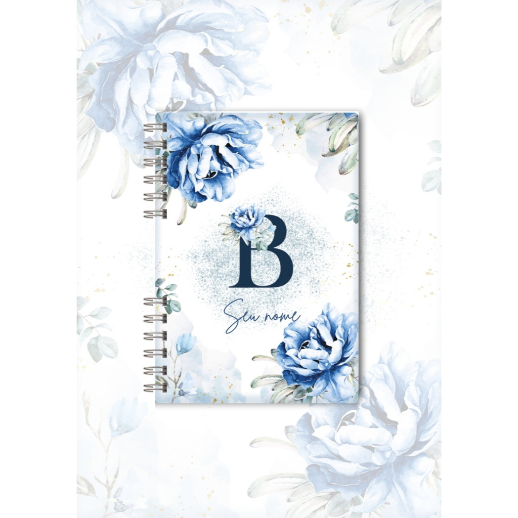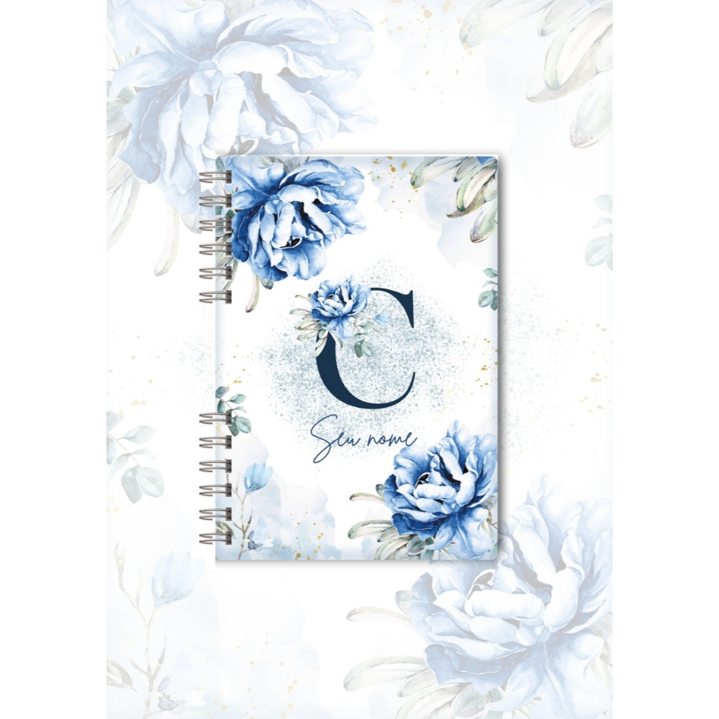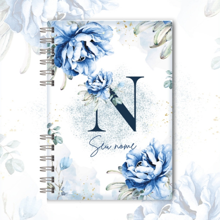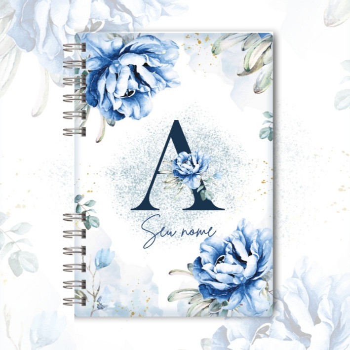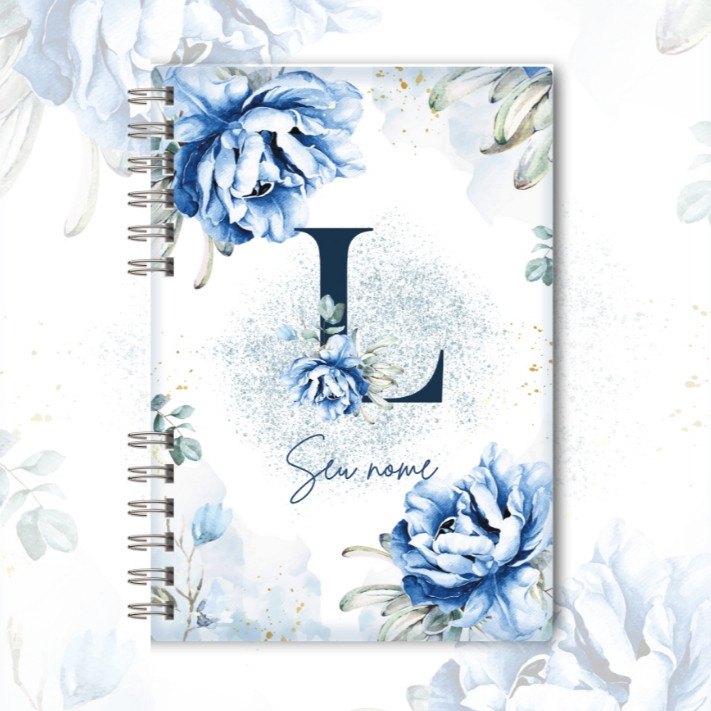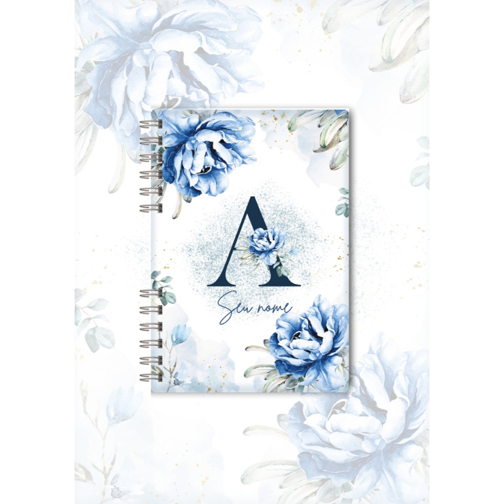 Caderno Floral Azul Personalizado Inicial Nome A5 Papelaria Arte Escritório Empresa Presente