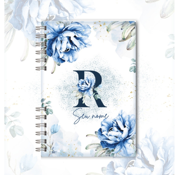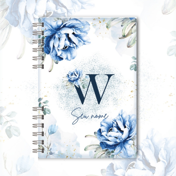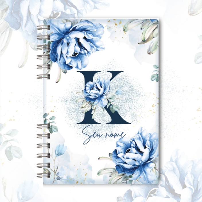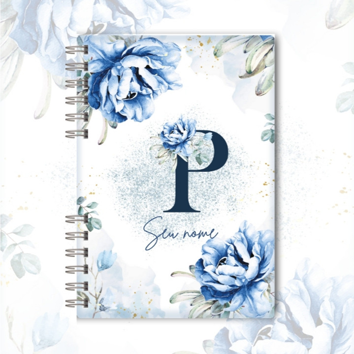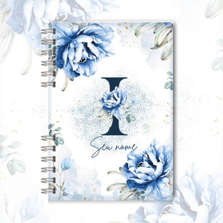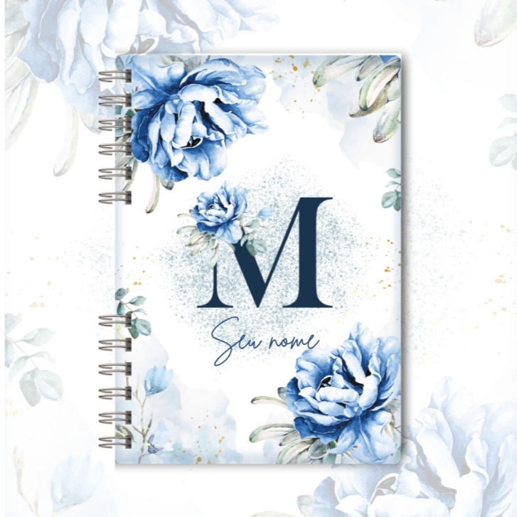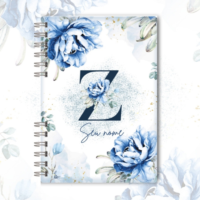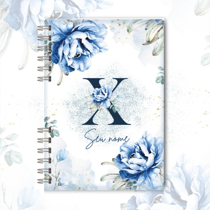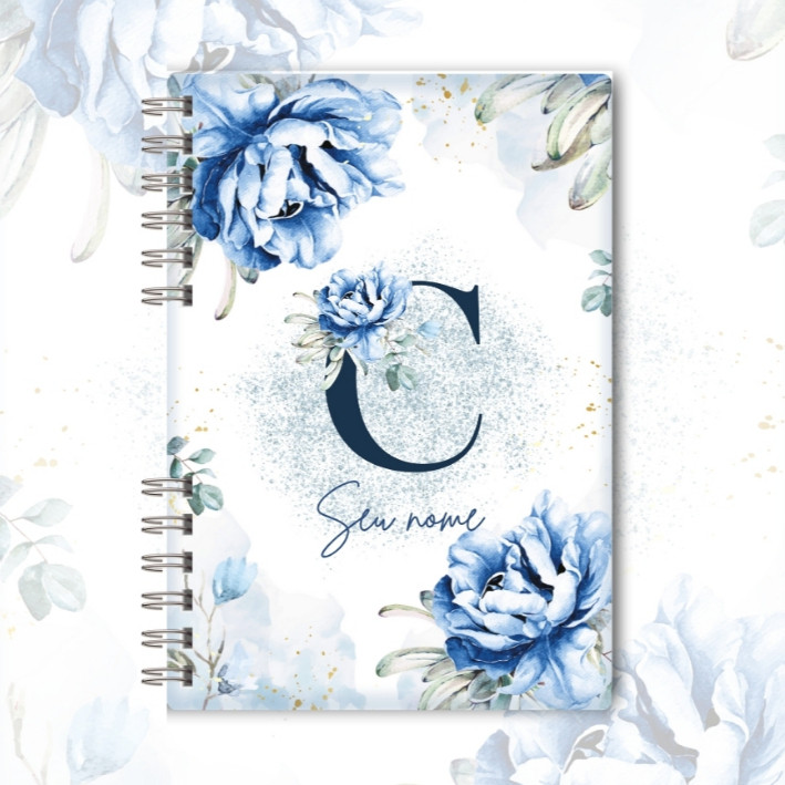 Caderno Floral Azul Personalizado Inicial Nome A5 Papelaria Arte Escritório Empresa Presente