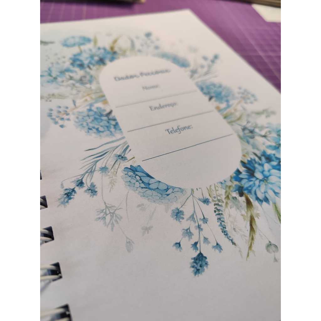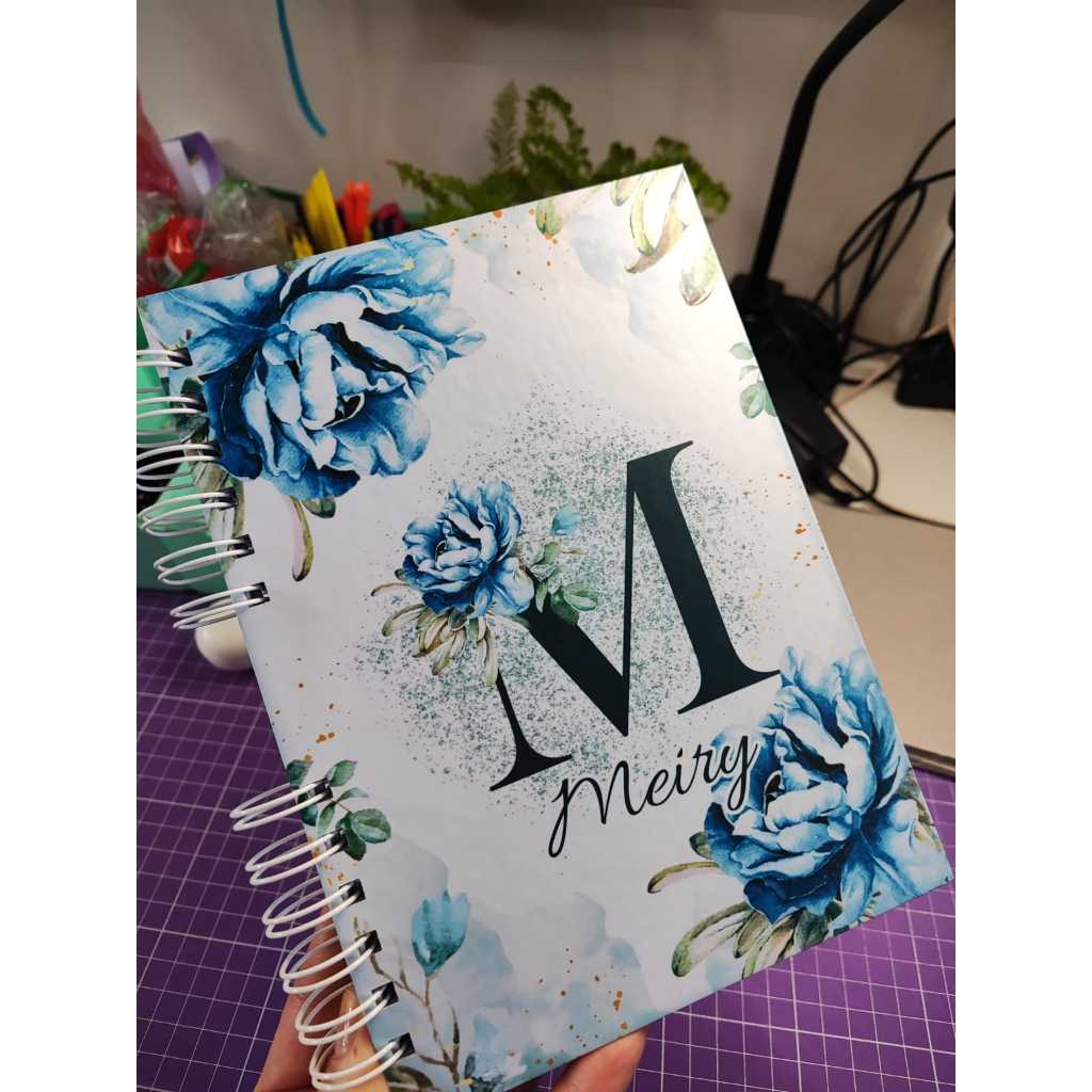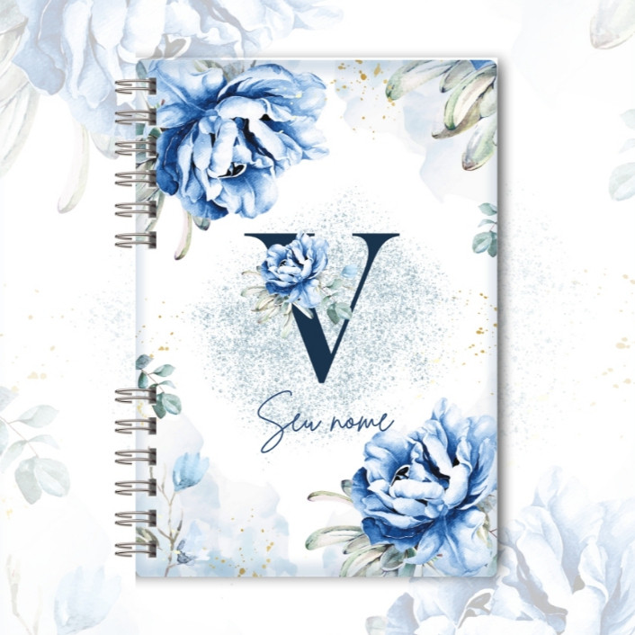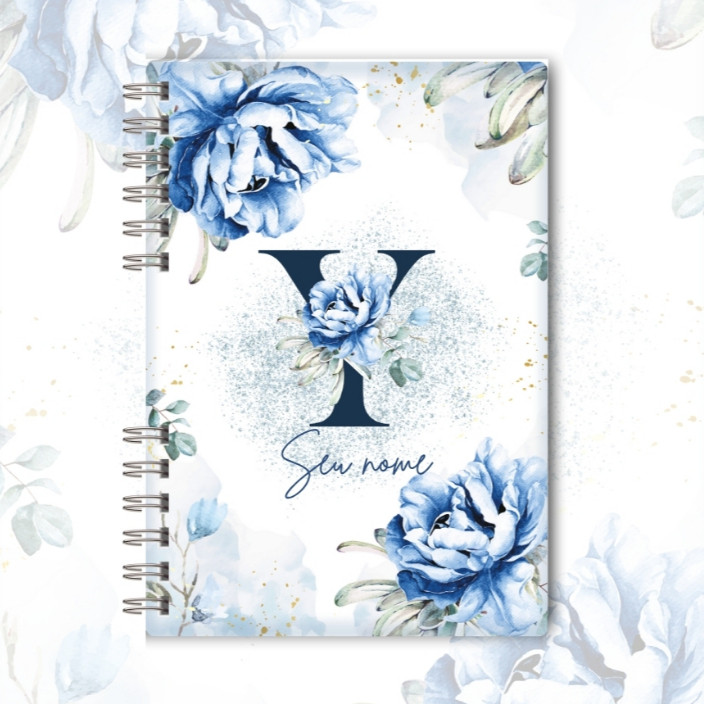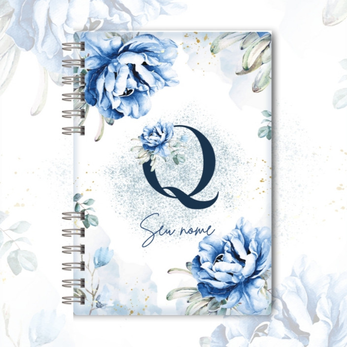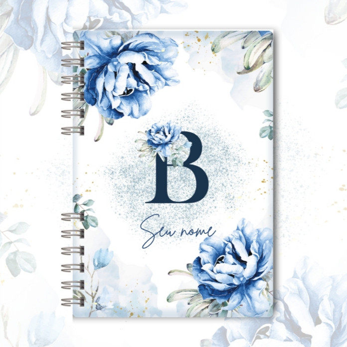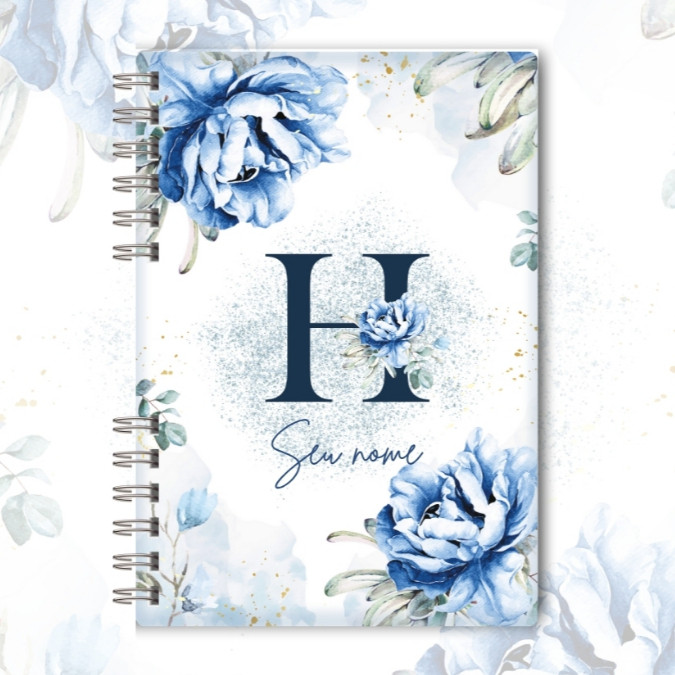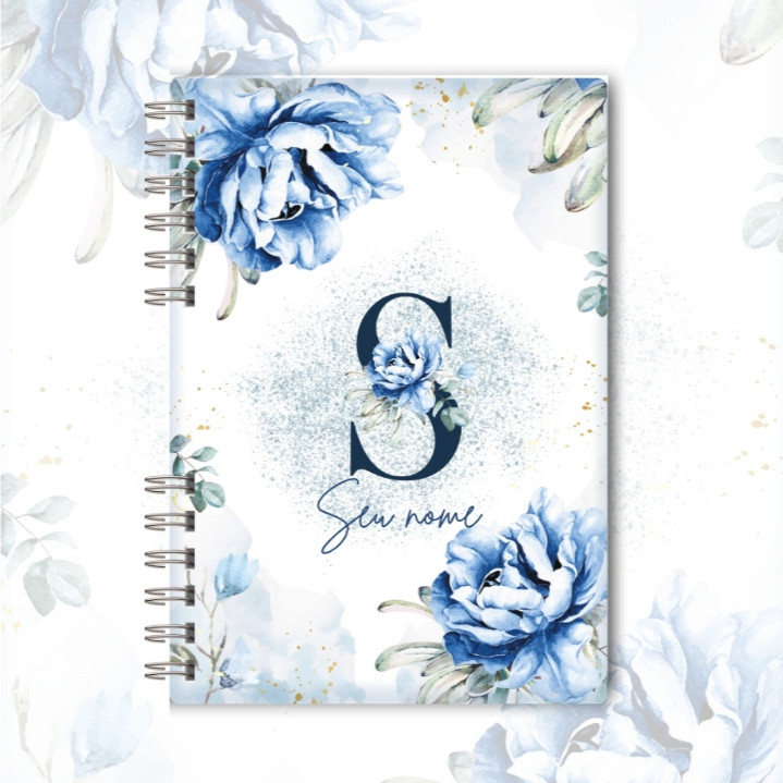 Caderno Floral Azul Personalizado Inicial Nome A5 Papelaria Arte Escritório Empresa Presente