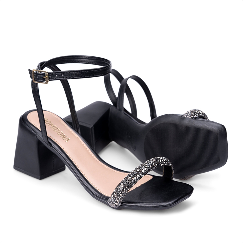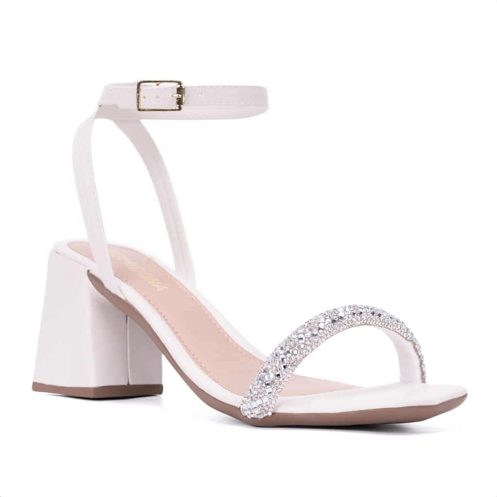 Sandália Feminina Domidona Salto Bloco Tira com Pedrarias Fivela Confortável