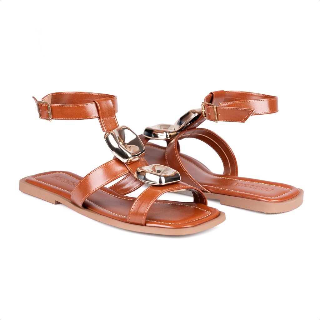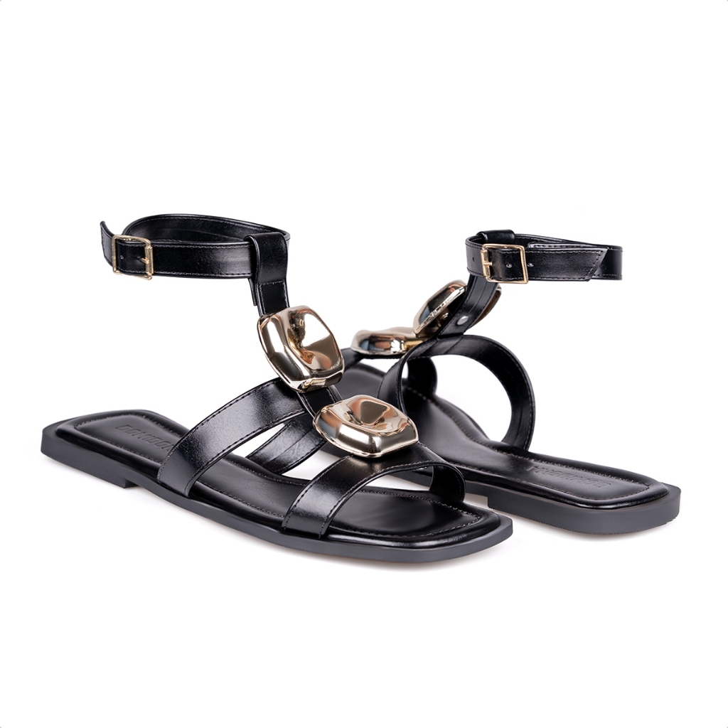 Sandália Feminina Domidona Rasteira Pedrarias Tira no Tornozelo Fivela Bico Quadrado