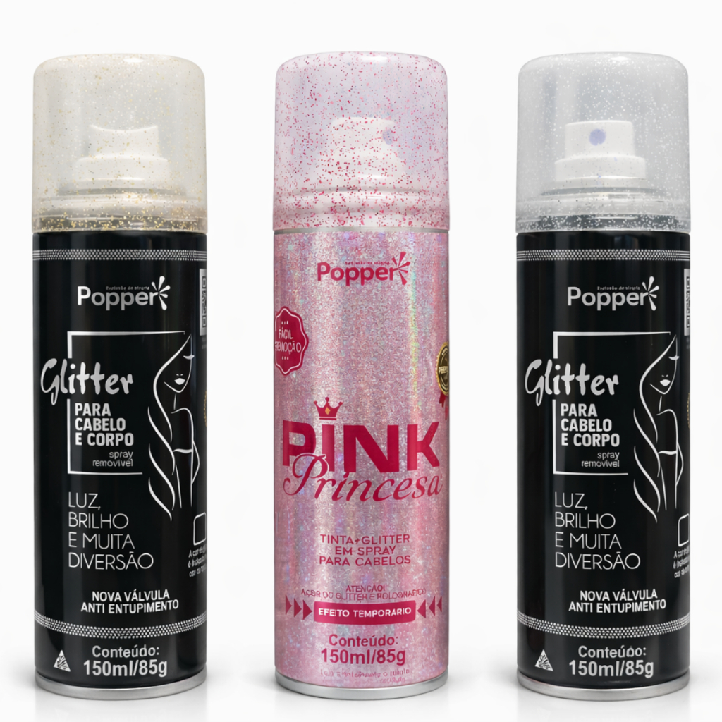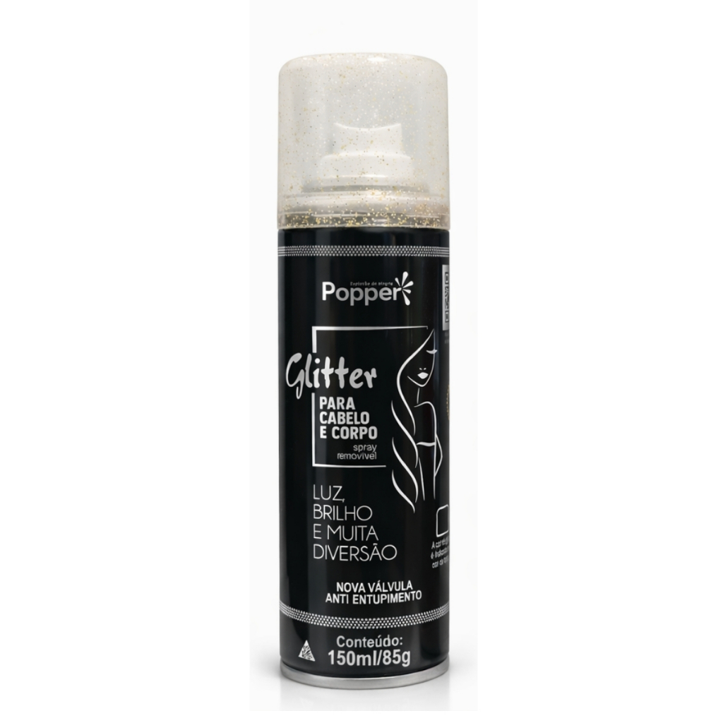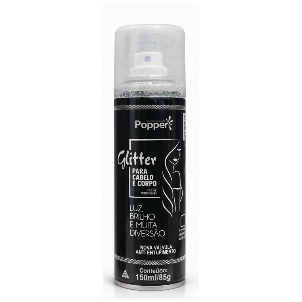 Spray Glitter Popper 150ml Para Cabelo Corpo e Roupa Válvula Anti-Entupimento Festa Carnaval
