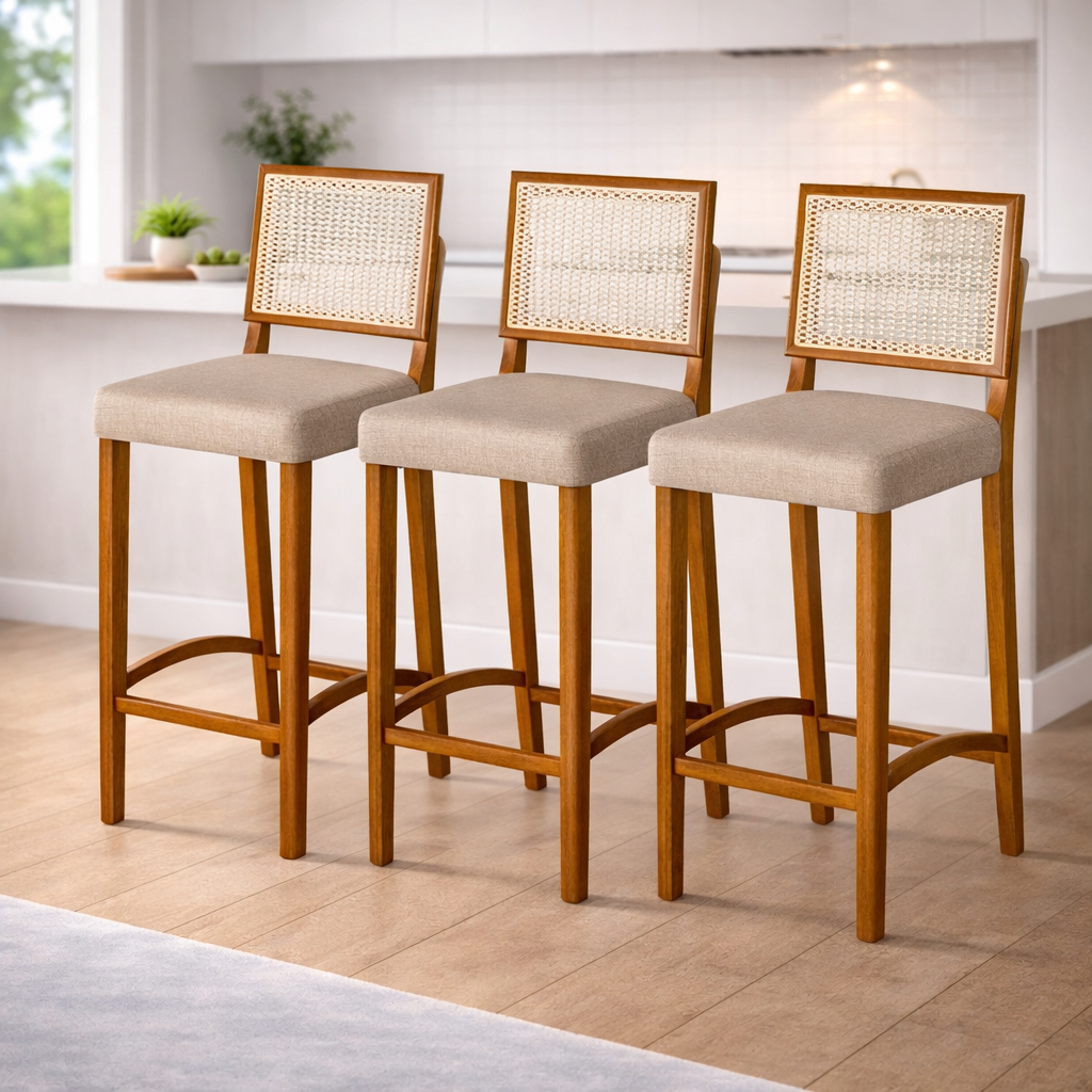 Kit 3 Banquetas Altas de Madeira com Encosto Rattan e Assento Estofado Cozinha Bancada Elegante