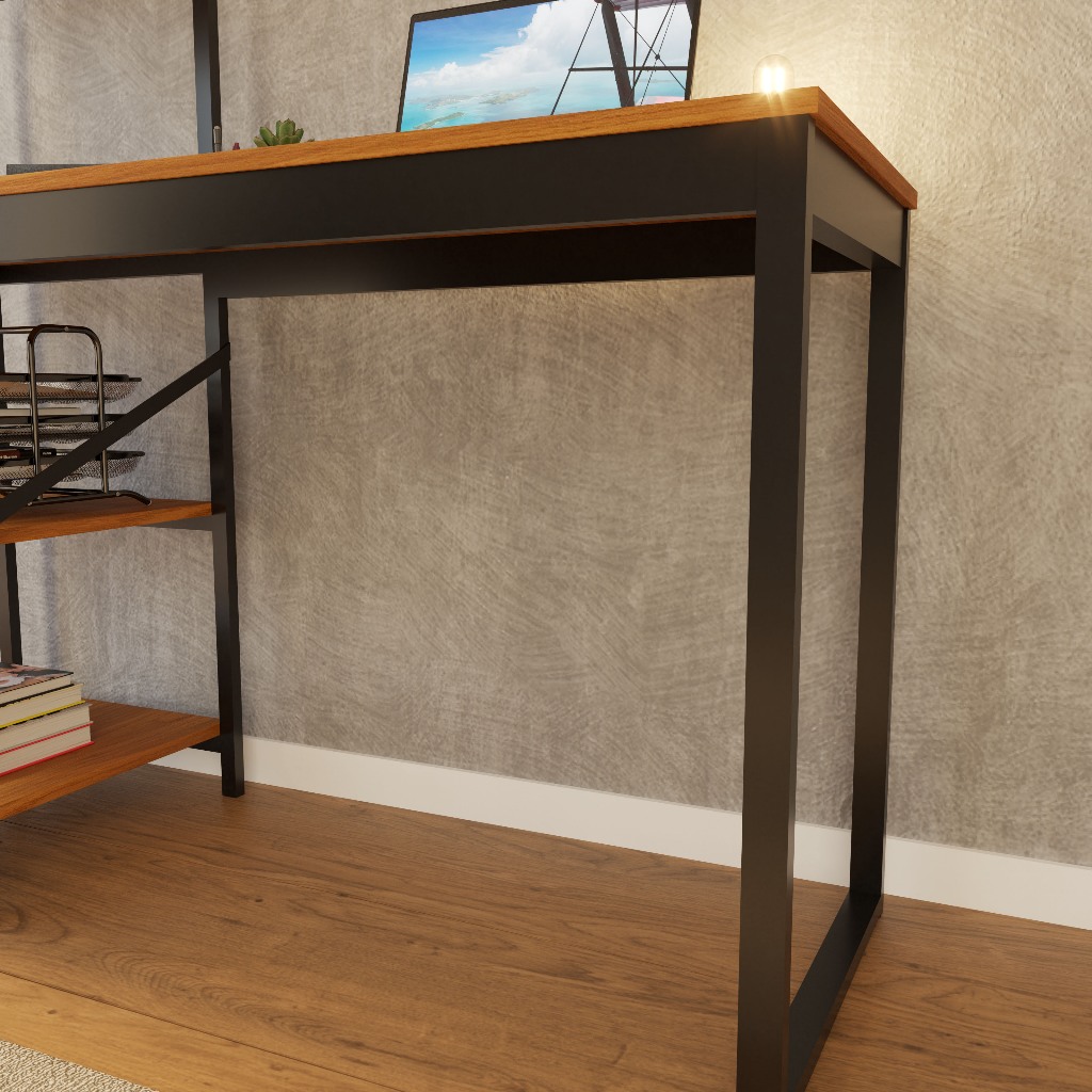 Escrivaninha Industrial com Estante Lateral 3 Prateleiras | Mesa Home Office Madeira Cor Canela
