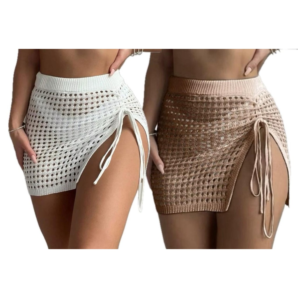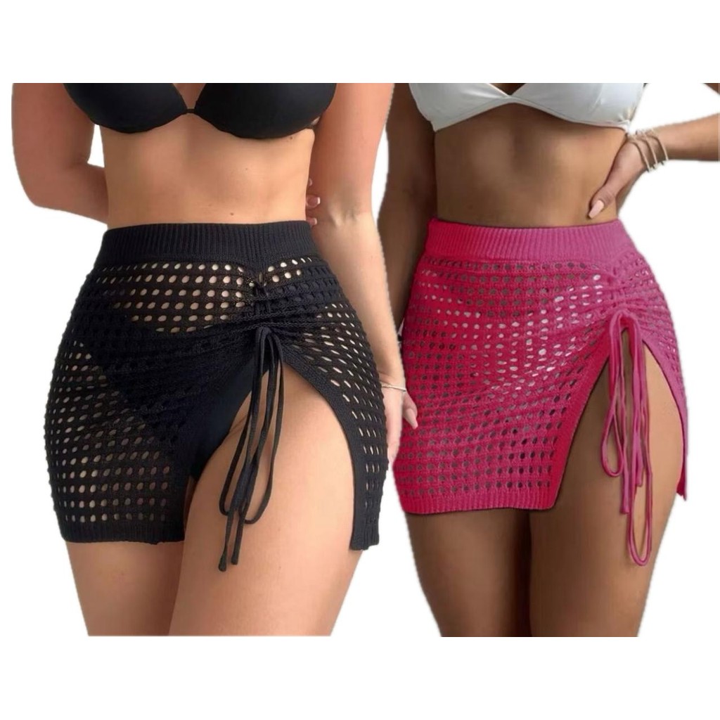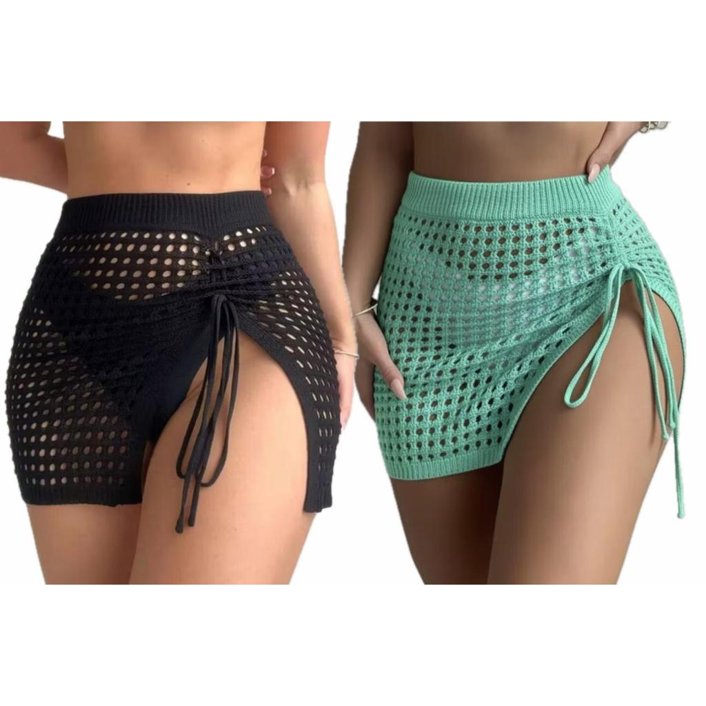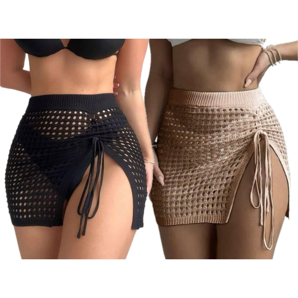 Kit 2 Saídas de Praia Saia Tricô Crochê Com Cordão Lateral Feminina Moda Verão