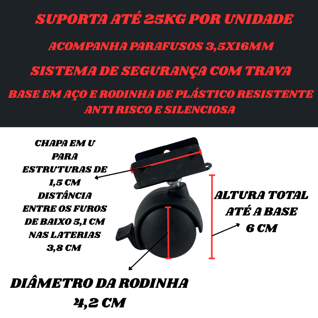 Kit 4 Rodízio Rodinha Preta Trava Chapa U 15mm Berço Móveis Preto